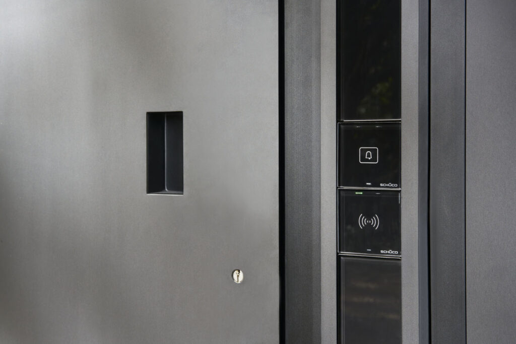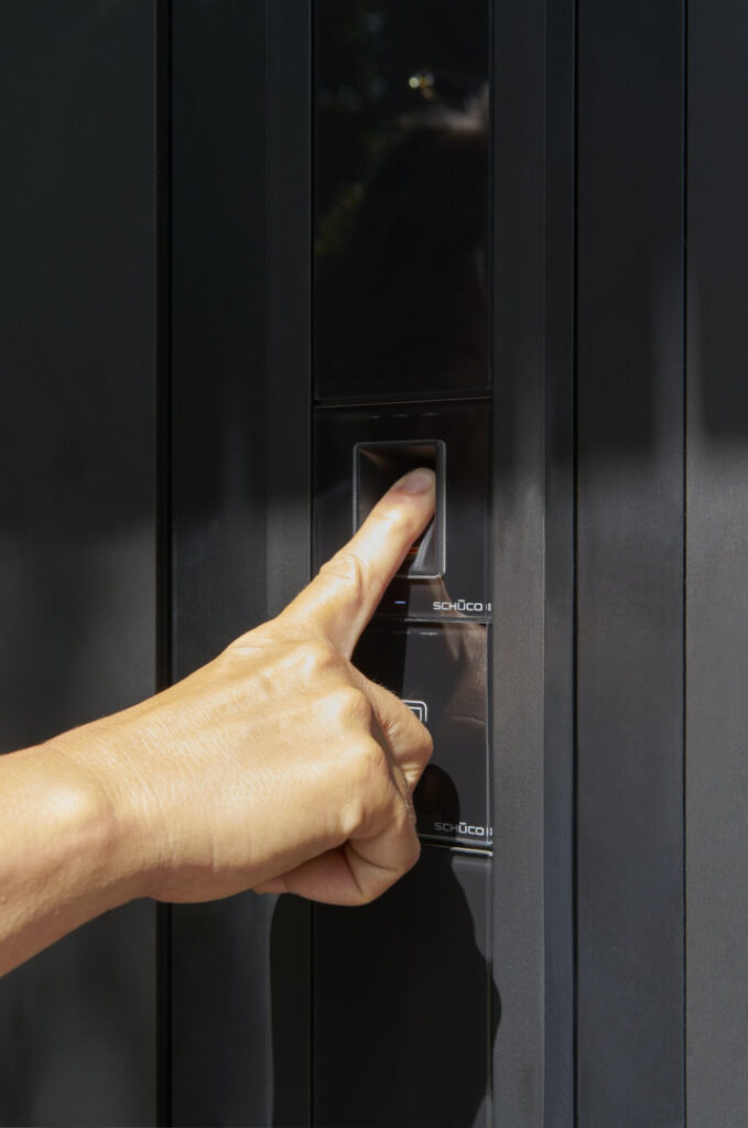 Vstupní dveře Schüco AD UP 90 se zapuštěným madlem a ovládacím panelem s čtečkou otisků prstu pro vstup