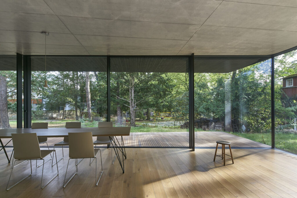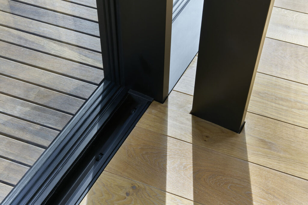 Posuvný systém Schüco ASE 67 PD byl realizován s nulovým prahem, aby byl zaručen plynulý přechod mezi interiérem a exteriérem, o což se stará i dubová podlaha uvnitř, na kterou navazuje bambusová terasa