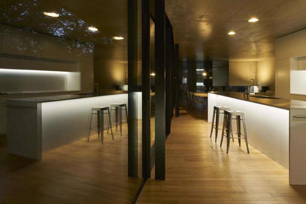 Navzdory omezeným dispozicím (3 pokoje) vytváří dům velkorysý prostor pro život. Stavbu tvoří železobetonová konstrukce, která přechází ve stěny a stropy z pohledového betonu. Veškerý nábytek byl vyroben na zakázku z bílého dřevovláknitého materiálu MDF. Dubová podlahová prkna, voskovaná ocel a corten ocel s nádechem rzi v exteriéru doplňují koncept surových materiálů. Kromě dvou oken je celá fasáda prosklená od podlahy až ke stropu včetně koupelny. Posuvný systém Schüco ASE 67 PD byl realizován s nulovým prahem, aby byl zaručen plynulý přechod mezi interiérem a exteriérem, o což se stará i dubová podlaha uvnitř, na kterou navazuje bambusová terasa. Spolu s vnějším okenním rámem skrytým v konstrukci budovy a úzkými pohledovými profily vytvářejí posuvné systémy Schüco parádní prostory zaplavené světlem a s maximální transparentností.