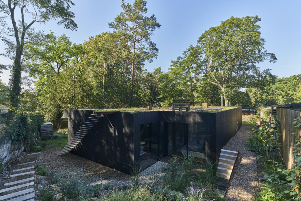 Na pozemku parkového střihu v památkově chráněné části Drážďan postavil dům pro sebe a syna architekt Martin Boden-Peroche. Jednopodlažní objekt se zelenou střechou a s fasádou s karbonově mořeným dřevěným obkladem, s černě eloxovanými profily okenních systémů Schüco a dalšími patinovanými materiály (corten ocel s nádechem rzi) koresponduje s lokalitou i starou populací stromů.