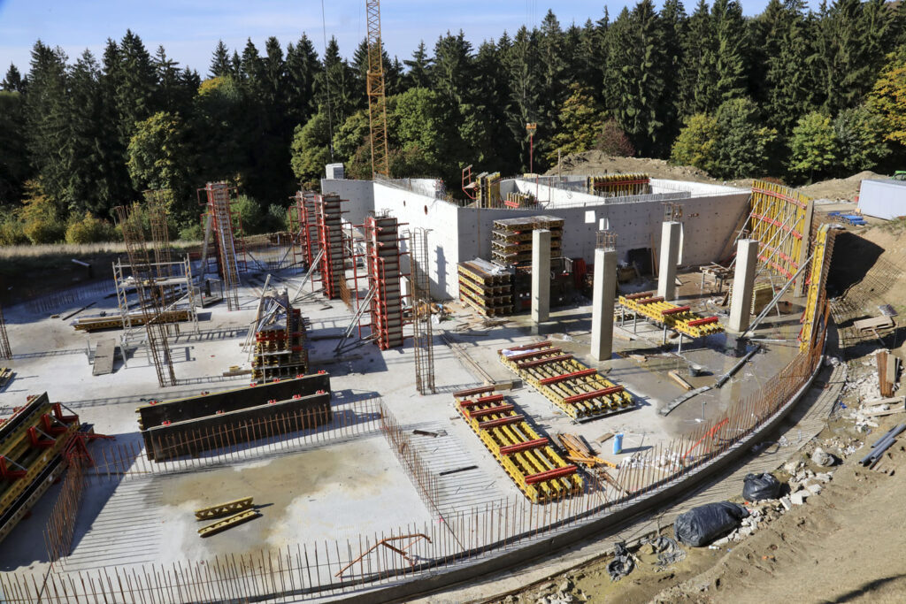 Na hlavní objekt byl připraven optimální návrh bednění z osvědčených systémů firmy PERI. Obvodové železobetonové stěny půdorysného elipsovitého tvaru byly řešeny nasazením panelů nosníkového stěnového bednění VARIO GT 24, které byly vzájemně spojeny kloubovými spojkami pro umožnění nastavení různých úhlů zakřivení mezi panely. Výšky stěn u tohoto objektu činily od 3,50 m do 5,40 m. Připravené samostatné panely bednění VARIO GT 24 byly poté nasazeny také na rovné železobetonové vnitřní stěny. Sloupy s výškou 3,50 m až 5,75 m byly bedněny systémem QUATTRO, který šetří čas využití jeřábu na stavbě, protože lze celý sloup včetně stabilizátorů a betonářské plošiny přemístit najednou.