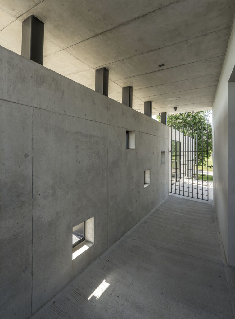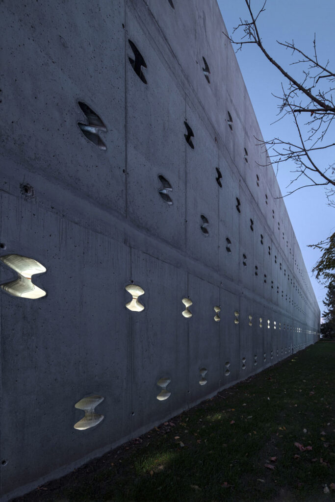 Parkovací dům v Dolních Břežanech Z východu a z jihu vymezují parkovací dům mohutné železobetonové zdi, které jsou prostoupeny zvláštními otvory. Jsou určeny k provětrávání a stejně jako umožňují prosvětlit vnitřní prostory přirozeným světlem, autor: Zdeněk Fránek / Fránek Architects, foto: Petr Polák