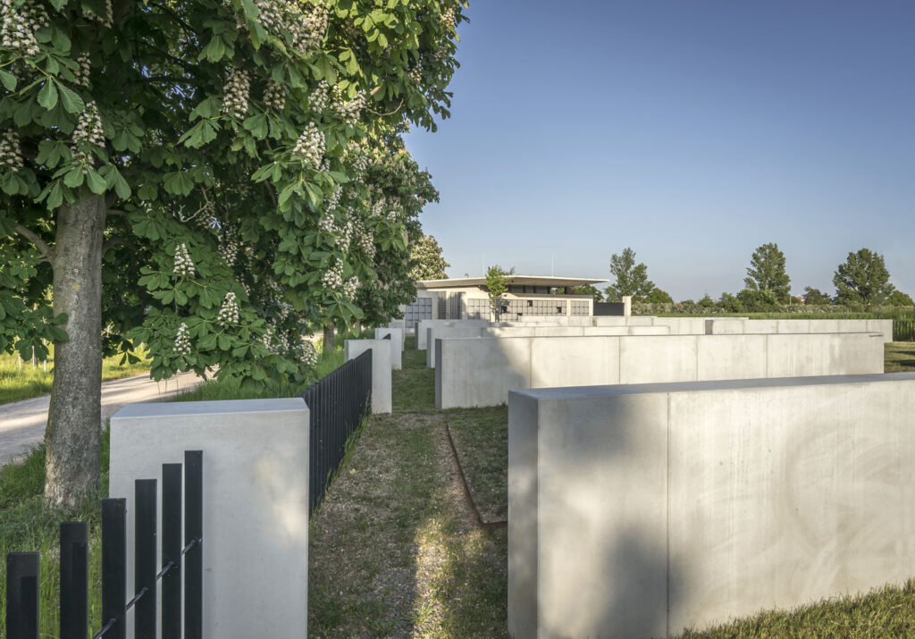 růst hřbitova podle aktuálních potřev, aniž se naruší celková soudržnost. Architekti vypracovali též manuál stanovující nejen výšky pomníků, ale také míry či druh kamene náhrobků. Beton je natolik silný, že dokáže přijmout i lyričtější projevy, v tomto ohledu je vlastně symbolickým rámem nesoucím paměť předků.