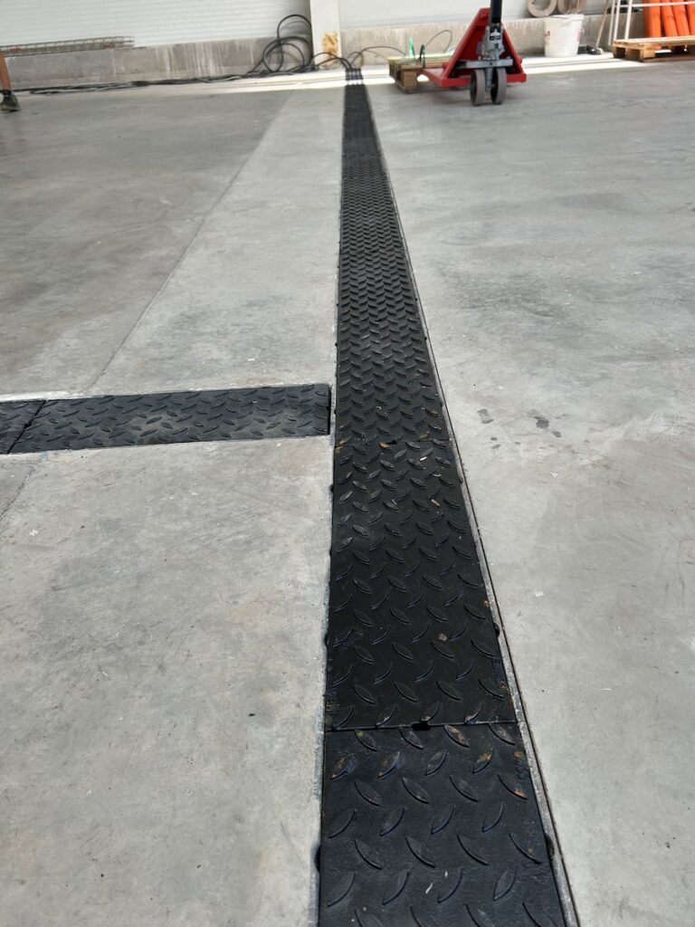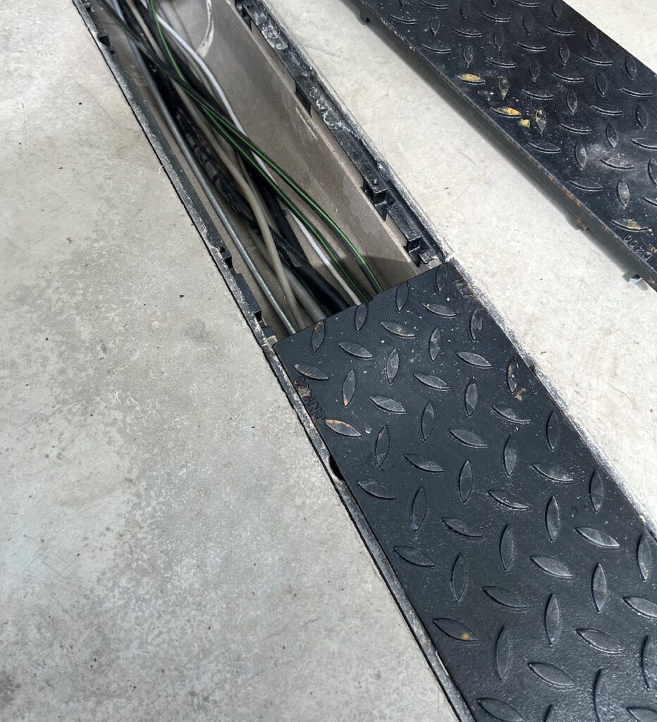 Kabely jsou vedeny ve žlabech z polymerického betonu EN 1500, které jsou zakryty plnými rošty Profix se zatížením D400 kN. Rošty tvoří funkci kabelových chrániček a vydrží i pojezd vysokozdvižných a paletových vozíků.