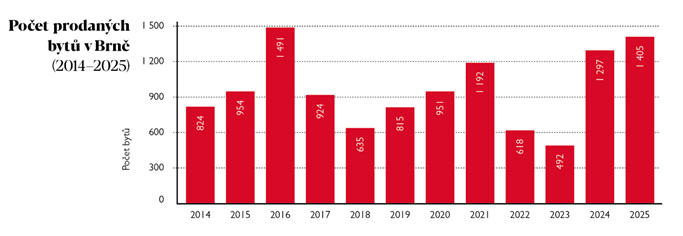 Ani závěr roku nepřinesl výraznější ochlazení trhu a ukázal, že Brno těží z pozice silného regionální centra. Ve čtvrtém čtvrtletí roku 2025 se prodalo 322 bytů, což je sice v meziročním srovnání o 83 jednotek méně, celková roční bilance však zůstává jednoznačně pozitivní. Výsledek roku 2025 překonal i dosud velmi úspěšný rok 2024, ve kterém se prodalo 1 298 novostaveb.