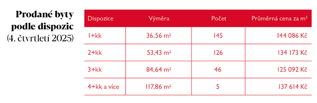 Rok 2025 ukázal, že brněnský trh se dokázal rychle přizpůsobit prostředí dražšího financování. Nejprodávanějšími se staly menší byty, které lépe odpovídají možnostem domácností v době vyšších úrokových sazeb. Dispozice 1+kk a 2+kk tvořily drtivou většinu všech transakcí a jen ve čtvrtém čtvrtletí se jich prodalo 271.
