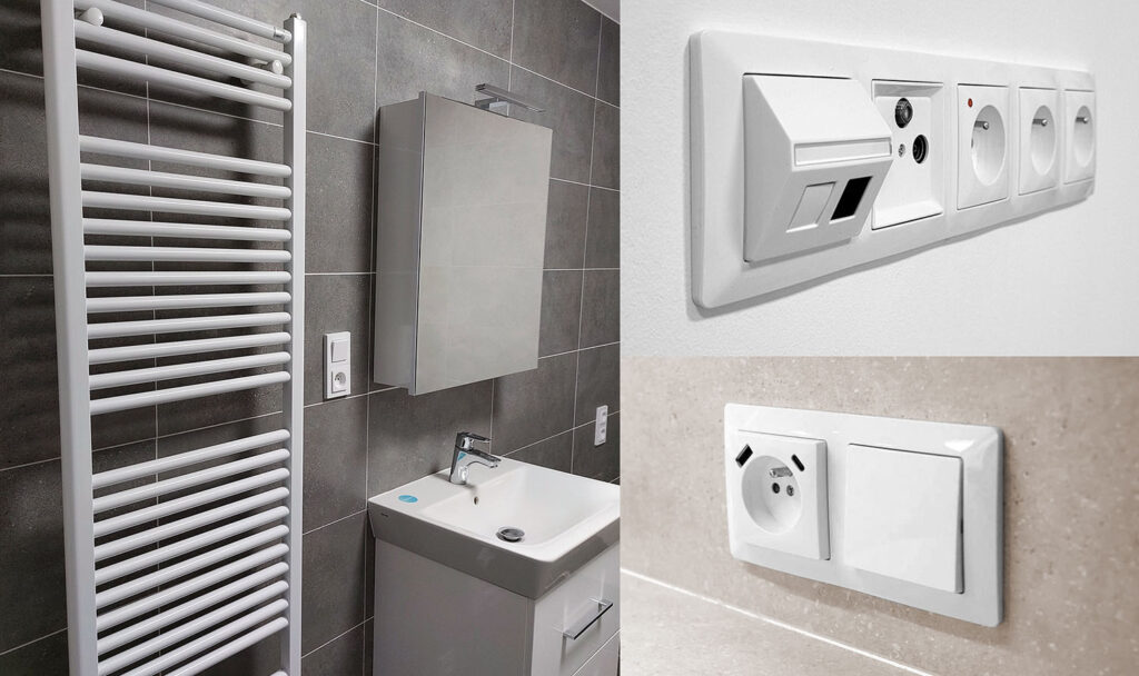 Klíčovým aspektem projektu byla flexibilita elektroinstalace. Pro koncové prvky byly zvoleny designové řady Levit v barvě bílá a Onyx a Zoni také v bílé. Obě nabízejí širokou škálu ovládacích prvků s bezšroubovými svorkami – od přepěťových zásuvek přes datové a anténní zásuvky až po USB nabíjení. Lze je instalovat do sestav až pěti rámečků, což umožňuje přizpůsobit rozmístění prvků individuálním požadavkům každého bytu.