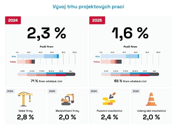 Trh projektových prací by měl růst do konce roku 2024 až o 2,3 %. Tento trend bude pokračovat také v roce 2025, a to o dalších až 1,6 %. Predikce pro příští rok jsou o něco méně optimistické než pro rok letošní. Společnosti, které se věnují převážně projektování inženýrských staveb, očekávají i v roce 2025 dostatek zakázek v rámci dopravní infrastruktury, a to zejména ze strany Ministerstva dopravy ČR. Obtíže ale vnímají u svých personálních kapacit, které mají téměř maximálně vytížené, což jim znemožňuje další zakázky přijímat. To se stává již pravidlem a výjimkou není ani tento rok, kdy projektové společnosti hlásí vytížení svých personálních kapacit na 93 %.  Stavebnictví dlouhodobě bojuje s nedostatkem kvalifikované pracovní síly, a také se stále klesajícím počtem absolventů technických oborů na středních i vysokých školách. Vláda se snaží na tento problém reagovat v rámci programu Strategie vzdělávací politiky.