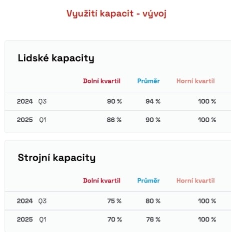Využití kapacit ve stavebním sektoru zůstává na vysoké úrovni, podobně jako u projektových firem. Aktuálně jsou lidské zdroje ve firmách využity z 94 %, což naznačuje intenzivní pracovní nasazení a vysokou poptávku po stavebních projektech. Naplnilo se tedy ještě více očekávání z jarních měsíců tohoto roku, kdy se s nástupem stavařské sezony očekávalo 92 % vytíženosti kapacit. Strojní kapacity firem jsou v současnosti využity z 80 %. Tato vytíženost odráží robustní činnost v odvětví. Přesto se v prvním čtvrtletí roku 2025 očekává mírný pokles, kdy by využití lidských kapacit mělo klesnout na 90 % a strojních na 76 %, kde se právě opět odrazí sezónnost v odvětví.