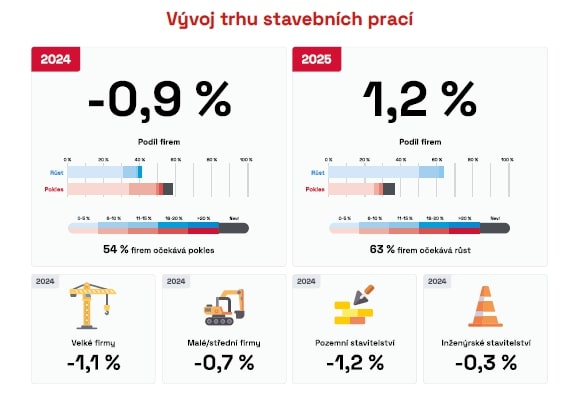 A velmi podobně vidí situaci na stavebním trhu i generální ředitel Metrostavu, Jaroslav Heran: „Pro rok 2025 jsme optimisté a předpokládáme obnovení růstu. Vycházíme z předpokladu, že zůstane zachována aktivita státu v investicích do infrastrukturních staveb, že budou v souvislosti s ekologizací energetiky a průmyslu zahajovány další významné projektya že se v neposlední řadě v celkových výkonech stavebnictví již významněji projeví oživení bytové výstavby, ke kterému pozvolna dochází již od konce loňského roku. Celkový výsledek za rok 2025 může být samozřejmě ještě ovlivněn řadou vlivů. Pozitivně se může projevit další snižování úrokových sazeb bankovních úvěrů a hypoték, nebo oživení investiční aktivity malých a středních municipalit. Velmi vážně by mohlo celé stavebnictví negativně zasáhnout případné nezvládnutí přechodu na digitalizaci stavebního řízení a jeho zablokování na delší dobu, nebo pokud by například došlo k významnému krácení veřejných rozpočtů v této oblasti.“