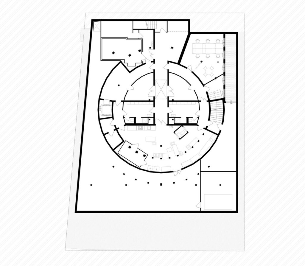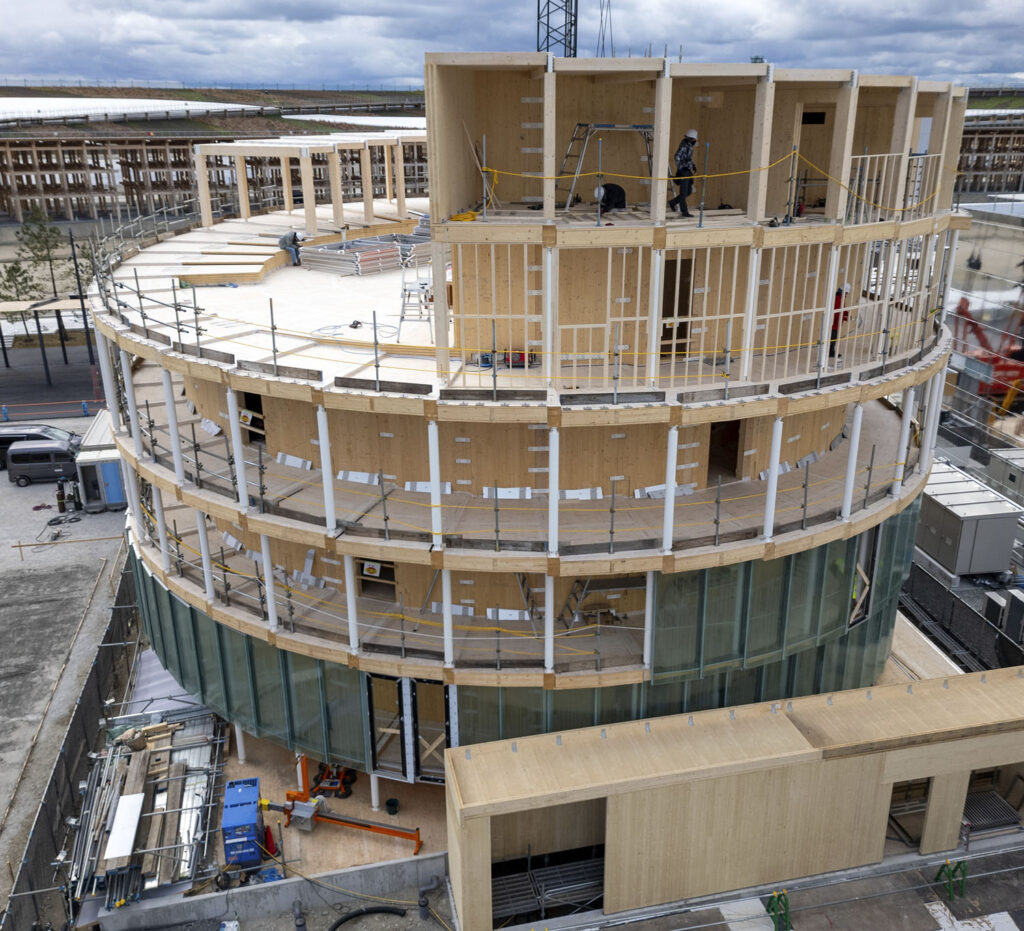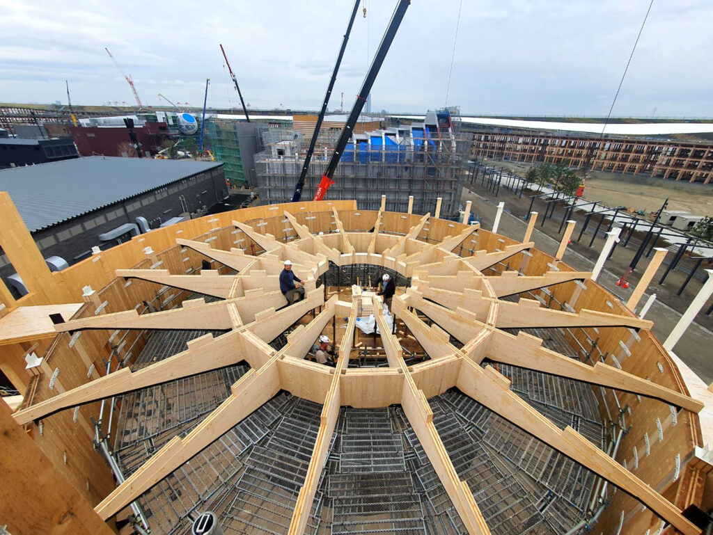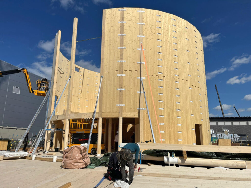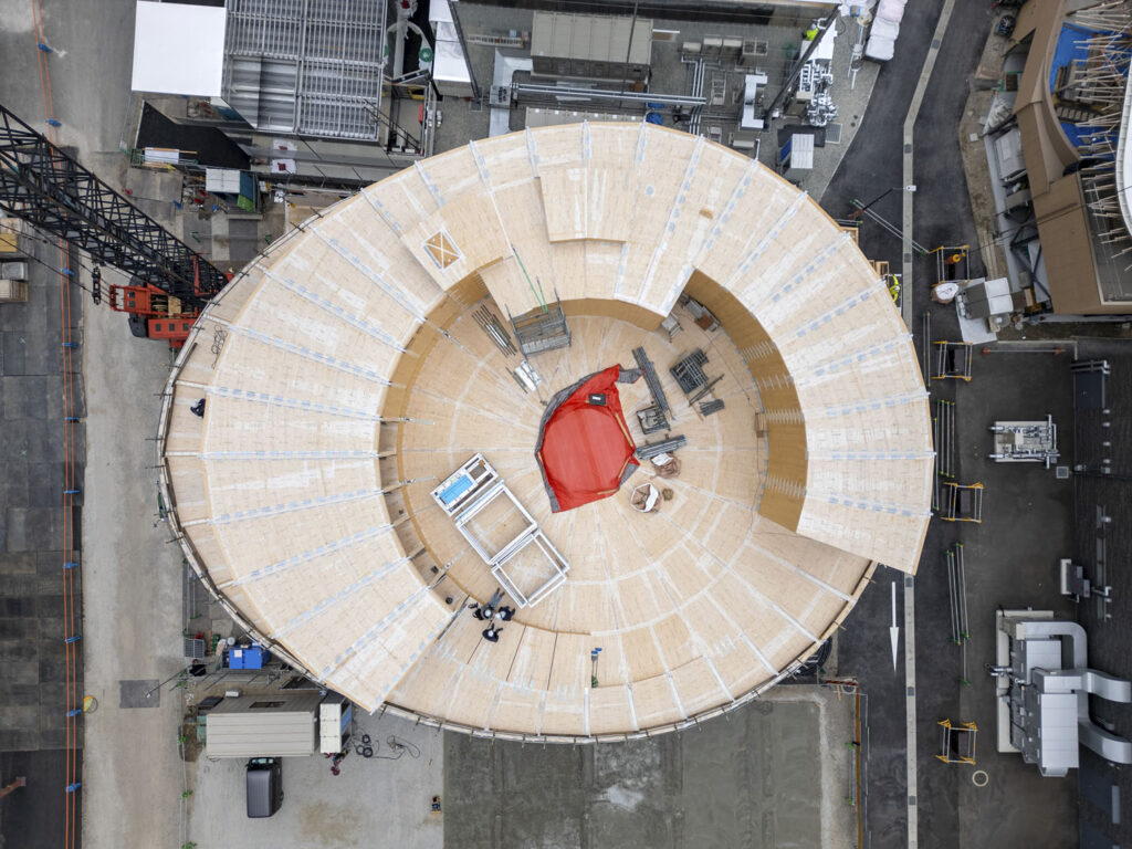 Základová konstrukce byla řešena jako bílá vana, vlastní založení se realizovalo na základové desce, po obvodě suterénního prostoru jsou betonové stěny. Do této konstrukce pak byla osazena dřevěná stěnová a sloupová konstrukce, kterou vymezuje výška suterénu. Její půdorysný tvar propisuje mezikruží horní stavby. Suterénní nosné prvky jsou zaklopeny dřevěným panelovým stropem, který podzemní část uzavírá. Hlavní svislá stěnová konstrukce je postavena na horní stranu tohoto stropu. Jedná se o vertikální dřevěné plošné dílce o výšce zhruba 11 m. Oba základní kruhy jsou vytvořeny z 36 segmentů, které se konstrukčně i pohledově propisují do celého objektu. Jednotlivé prvky volil tým společnosti A2 Timber tak, aby byla jednoduchá i jejich demontáž. Stavební díly konstrukce byly omezeny zejména ve svých rozměrech, limitní byl návrh rozměrů, který umožňuje rozměr přepravního kontejneru.