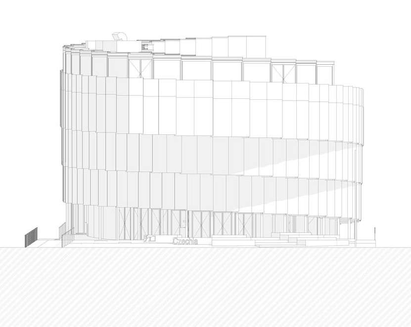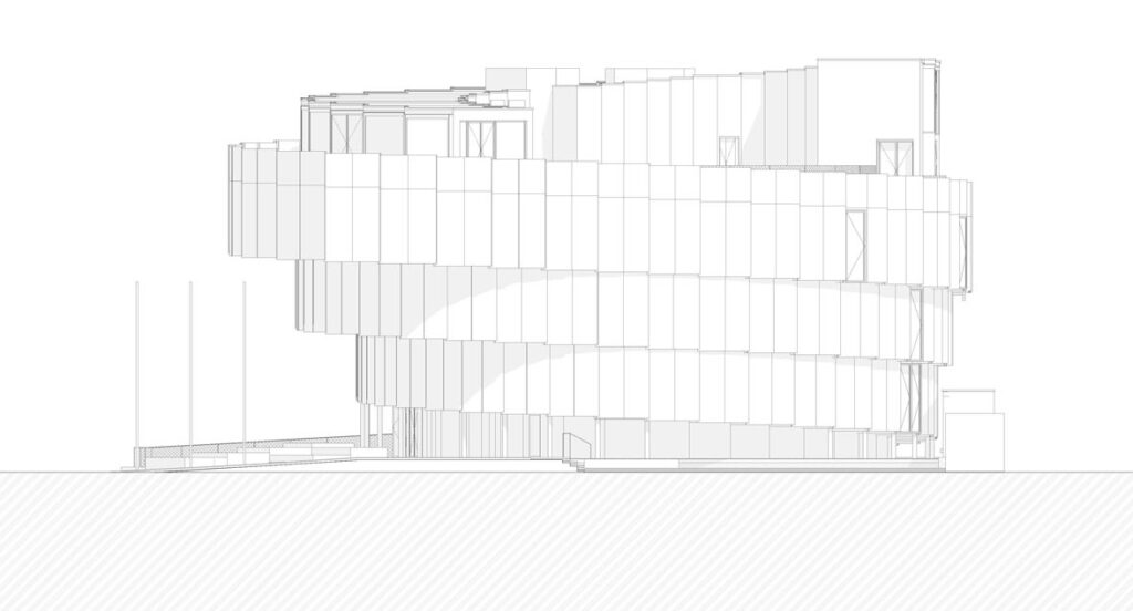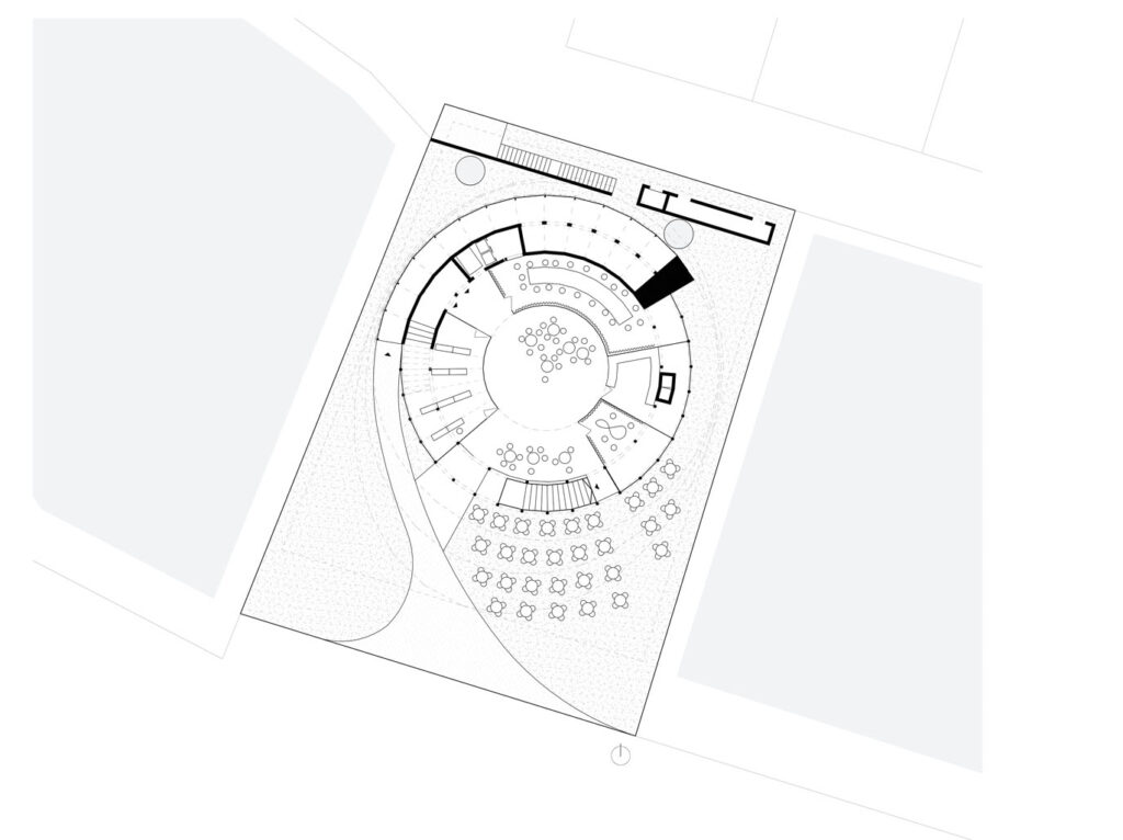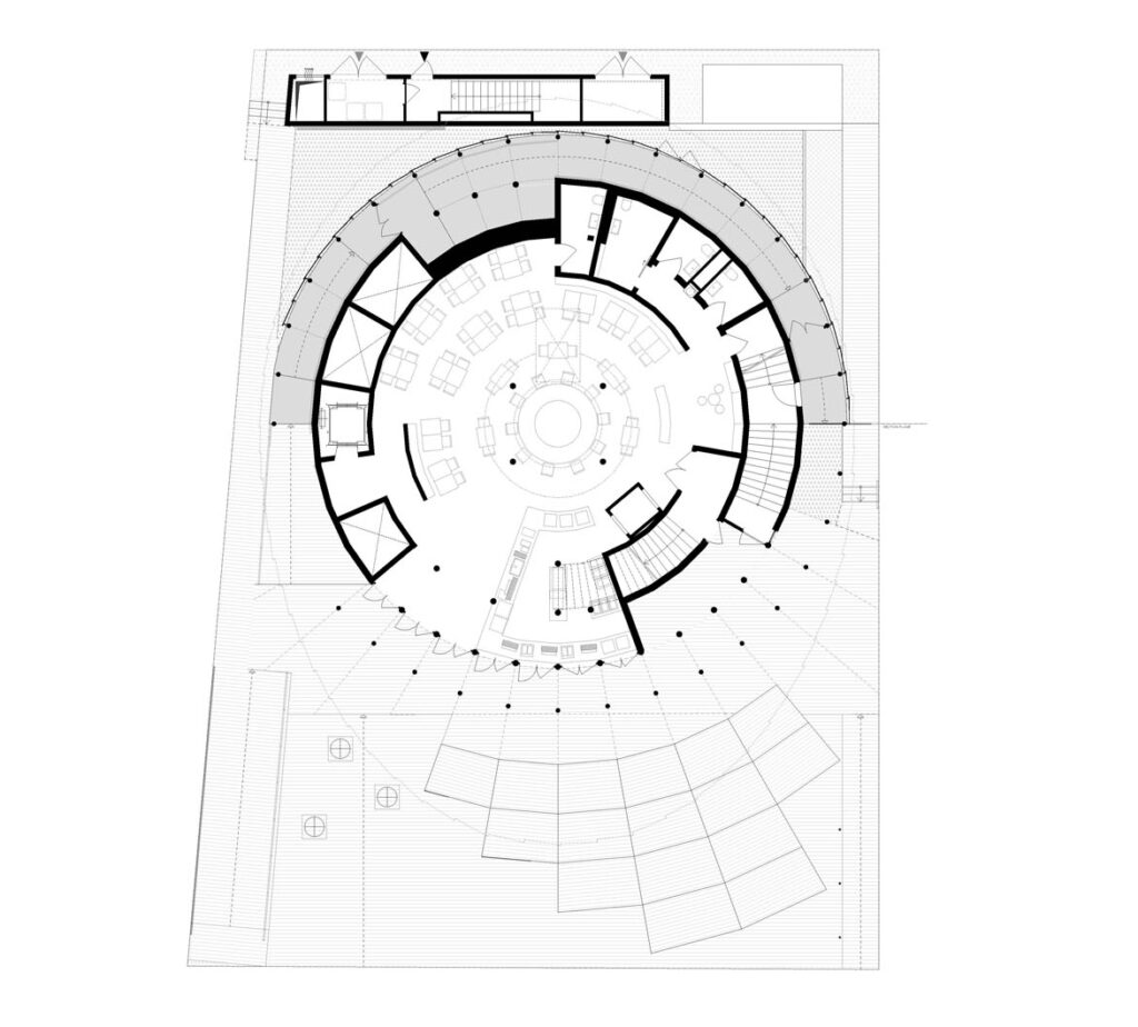 Hmota domu se směrem vzhůru vyklání nad svou půdorysnou stopu a graduje. „Soustředná spirála se obtáčí kolem auditoria, její šířka se pohybuje od 1,8 do 7 m. Ve výšce 12 m ústí rampa na vyhlídkovou terasu. Zážitkem je nejen výhled na celý areál a na moře, ale i průhled proskleným světlíkem dolů směrem do auditoria. Prostorový koncept domu je tak naprosto čitelný,“ upřesňuje Michal Gabaš.