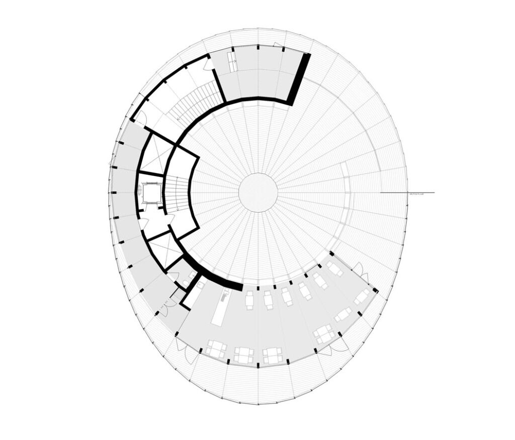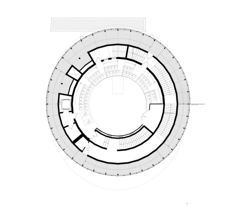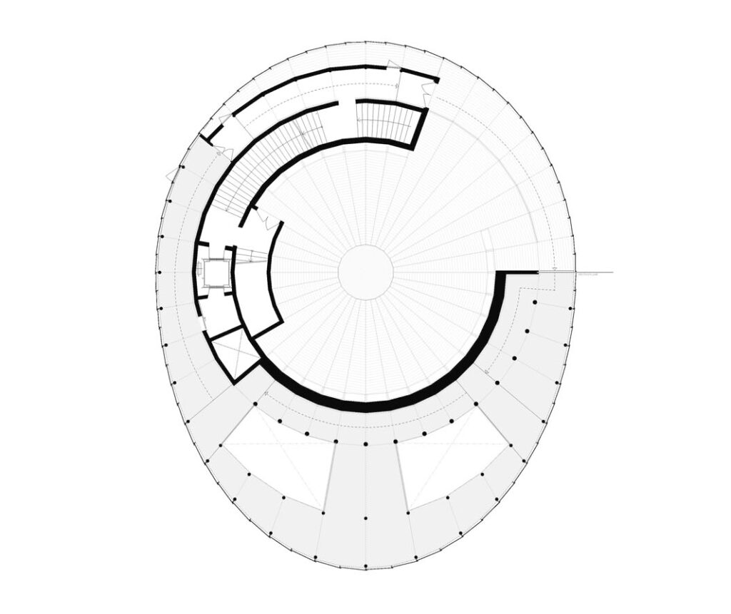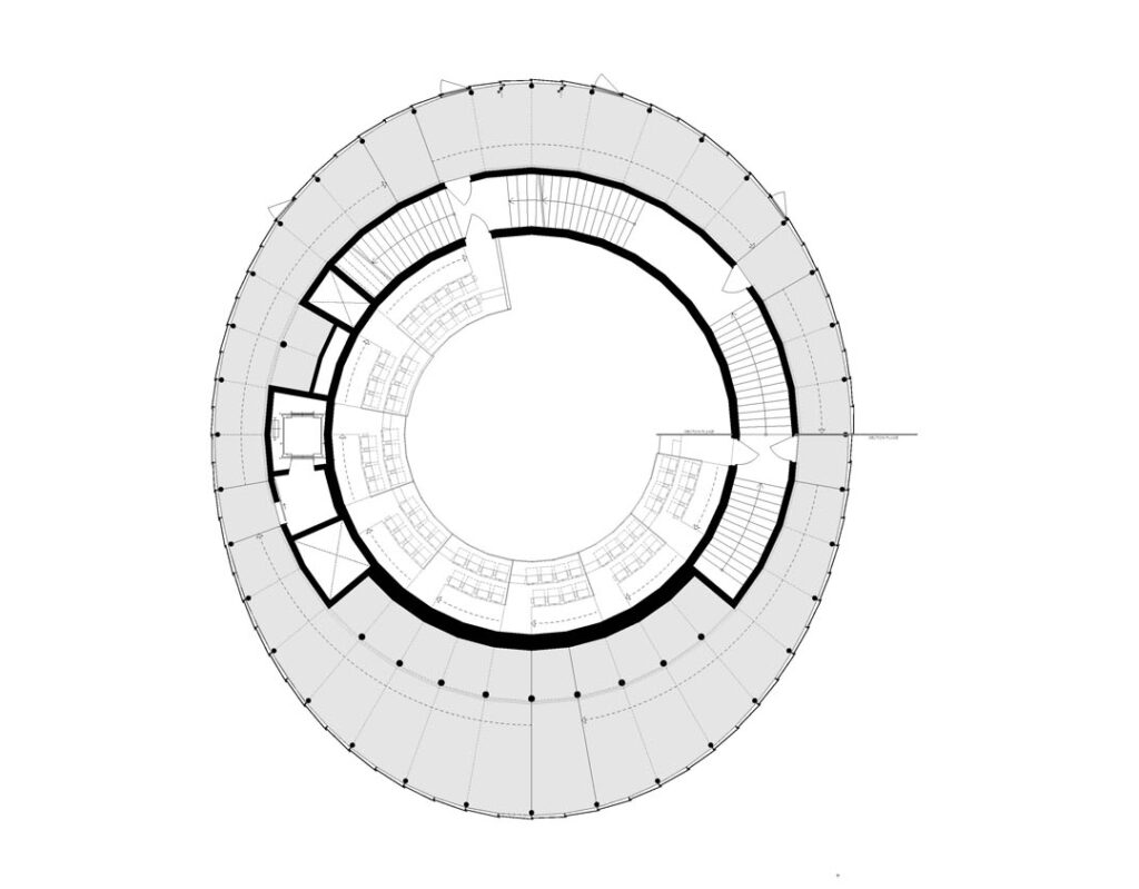 „Do vnitřního kruhu jsme nad přízemím vestavěli strop z dřevěných plošných dílů, který tvoří nosnou konstrukci auditoria. Konstrukčně ho lze popsat jako desku, která je podepřená po obvodu a má centrální hlavici podepřenou na čtyřech sloupech uprostřed objektu. Nad auditoriem je další strop, opět uspořádaný do kruhu vyplňujícího vnitřní mezikruží. Z hlediska struktury se jedná o vzpínadlovou desku podepřenou po obvodě nosnými stěnami na vnitřním kruhu. Strop opět tvoří plošné dřevěné panelové dílce. Na vytvořený tuhý vnitřní tubus je osazena konstrukce chodbové spirály. Základní desková konstrukce tedy tvoří spirálu stoupající kolem celého objektu. Podepřena je nosníky vedenými po radiále od obvodu do centra konstrukce. Délka nosníku a šířka chodbové spirály je definována stopou fasády i vnějším obvodem hlavní nosné konstrukce. Na vnějším fasádním obvodě jsou osazeny ocelové sloupy, které podpírají spirálové nosníky umístěné na 37 radiálách respektujících 36 segmentů základního kruhu. Mezi tyto nosníky je pak osazena dutá stropní deska. Ta je volena s ohledem na korekci hmotnosti pro dodržení podmínky omezení hmotnosti konstrukce,“ říká Ing. Krbec a dodává: „Uvnitř auditoria jsou balkony hlediště ve formě konzoly. Její konstrukci tvoří jednoduchá deska, která je momentově fixovaná na nosnou stěnu. Z geometrického hlediska se jedná o prvek, který prochází přes tři segmenty. S ohledem na převládající směr namáhání, tedy ohyb na horní straně prvku, je CLT deska uspořádaná tak, že horní dvě vrstvy jdou rovnoběžně se směrem namáhání. Závěrečným prvkem konstrukce je pak prostor v posledním patře. Na základní nosnou konstrukci je v požadované výseči radiálně umístěno schéma příčných rámů, zaklopených CLT panely.“