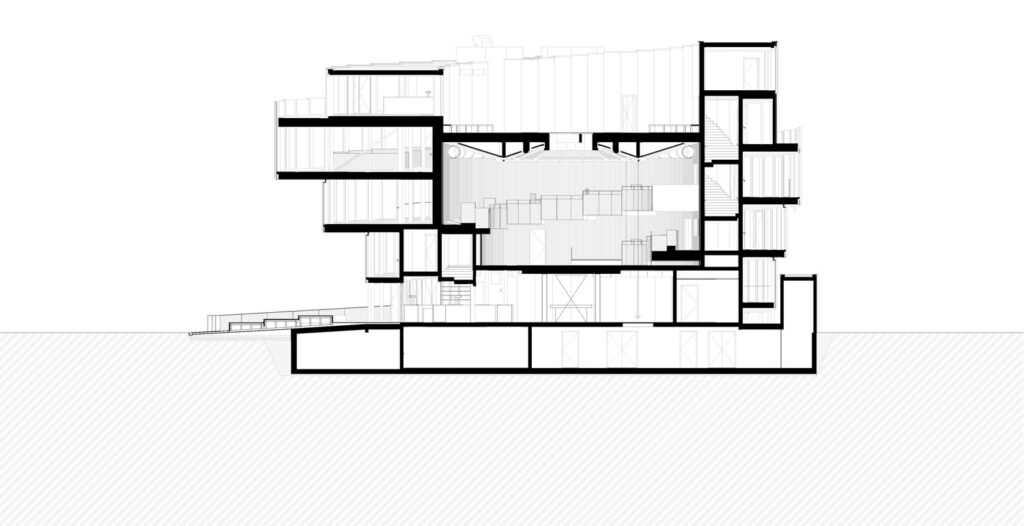 K cestě směrem dolů slouží dvě schodiště vetknutá do dutiny zdvojených stěn válce, ústí v parteru. Jedno z nich je určeno pro návštěvníky, druhé je služební. Centrální tubus auditoria slouží jako multifunkční sál. Jeho prostor s vnitřním průměrem 15,5 m se tyčí do výšky 12 m, koncipován byl jako tzv. black box. Rampa se sedadly v auditoriu kopíruje obvod návštěvnické cesty, přičemž hlediště a galerie jsou na několika místech propojeny. Díky tomu lze tyto prostory oddělit nebo spojit podle aktuálních potřeb.