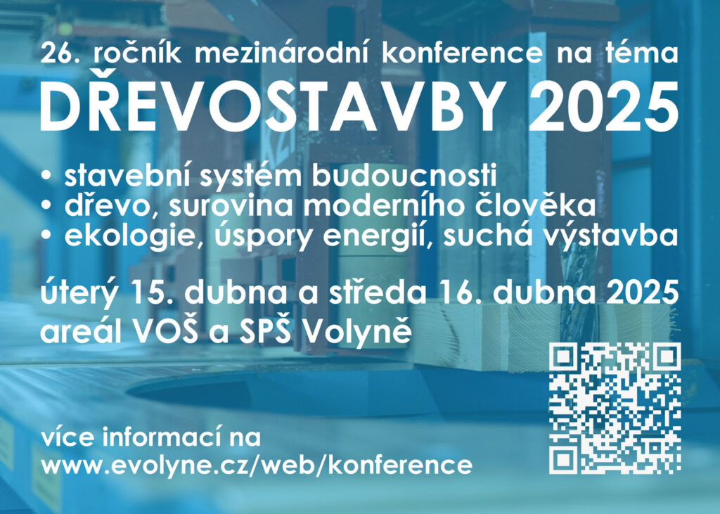 V úterý 15. dubna 2025 a ve středu 16. dubna 2025 proběhne na VOŠ Volyně XXVI. ročník mezinárodní odborné konference “Dřevostavby”.