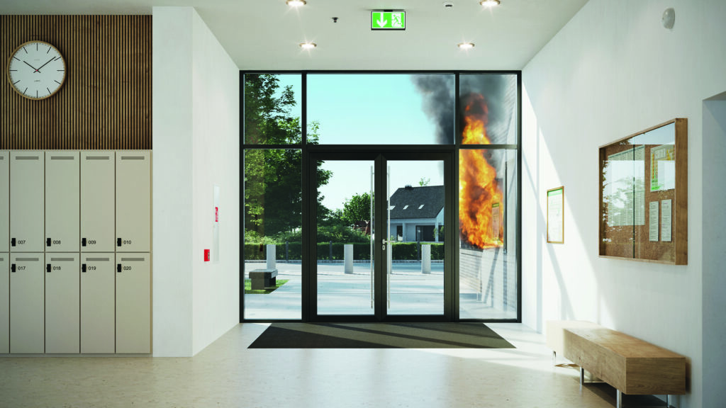 Pro zamezení šíření požáru a zabezpečení nouzových únikových cest jsou protipožární řešení potřebná nejen v interiéru, ale i ve vztahu k venkovnímu prostoru. S novými protipožárními dveřmi Schüco FireStop ADS 90 FR 90-CE zdokonalilo Schüco své systémové portfolio o řešení pro venkovní použití s prodlouženou 90minutovou ochranou. Dveřní systém s klasifikací CE kombinuje skrytou protipožární ochranu se stabilitou a nízkou hmotností, nové protipožární sklo snížilo hmotnost dveří cca o 40 %. Hliníkové protipožární dveře Schüco FireStop ADS 90 FR 90-CE zároveň dosahují nejvyšší úrovně mechanické pevnosti (třída 4) pro použití v obzvlášť náročném zatížení.