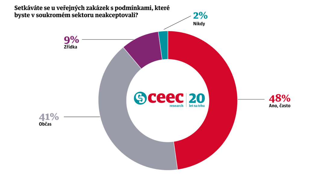 Téměř polovina firem (48 %) uvádí, že se pravidelně setkává s podmínkami, které by v komerčních zakázkách nepřijala. Dalších 41 % se s takovými požadavky potýká alespoň občas. Firmy často upozorňují na nejasnosti v zadávací dokumentaci, rozdílný výklad zákona o veřejných zakázkách nebo zdlouhavé změnové řízení.