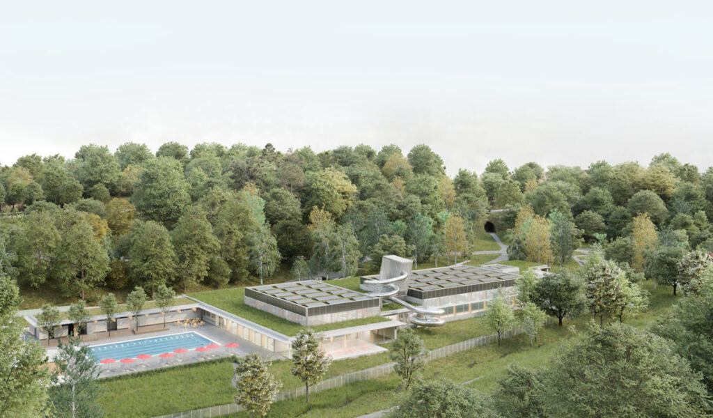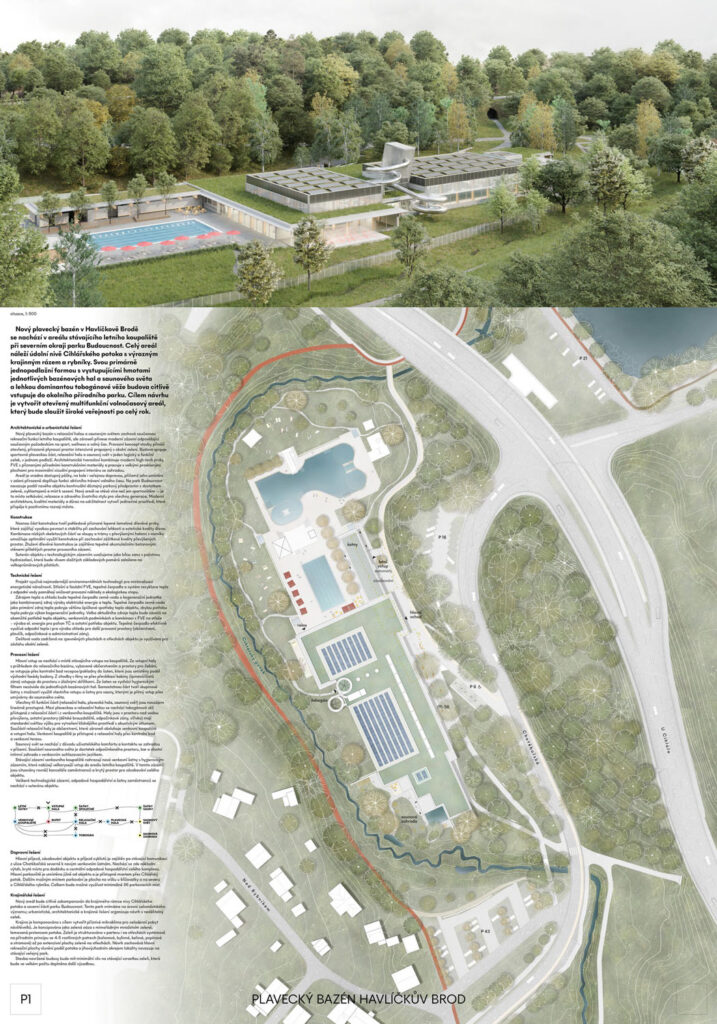 Porota složená ze zástupců města a nezávislých architektů vybrala vítězný návrh na základě kritérií, které zohlednily nejenom architektonické, ale i technické a provozní požadavky. Zároveň se hledalo řešení, které vhodně doplní volnou plochu mezi venkovním koupalištěm a Cihlářským potokem. Stavba je jednopodlažní, s převýšenou částí bazénových hal a její dominantou je toboganová věž. Charakteristická silueta může vzdáleně připomínat parník. Areál nabídne tři hlavní zóny: plavecký bazén s šesti dráhami o délce 25 metrů, relaxační část s vířivkami a atrakcemi a saunový svět s přímým kontaktem se zelení a venkovním ochlazovacím jezírkem. Stavba také nahradí stávající zázemí letního koupaliště novými šatnami a obslužným zázemím.