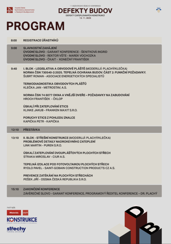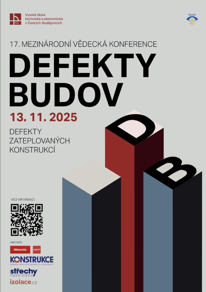 Dovolujeme si Vás pozvat na již 17. ročník odborné konference Defekty budov, která se uskuteční 13. listopadu 2025 v Českých Budějovicích. Tuto prestižní událost pořádá Katedra stavebnictví Vysoké školy technické a ekonomické v Českých Budějovicích (VŠTE) ve spolupráci s Českou komorou autorizovaných inženýrů a techniků (ČKAIT).