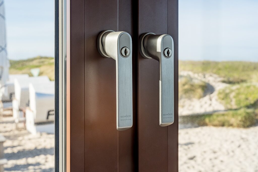 Stavební předpisy týkající se ochrany pobřežních oblastí a dun a požadavky na dostatečnou ochranu proti větru a dešti „vybraly“ pro Sansibar systémy Schüco, na obrázku posuvný systém se zdvihem Schüco ASE 80.HI.