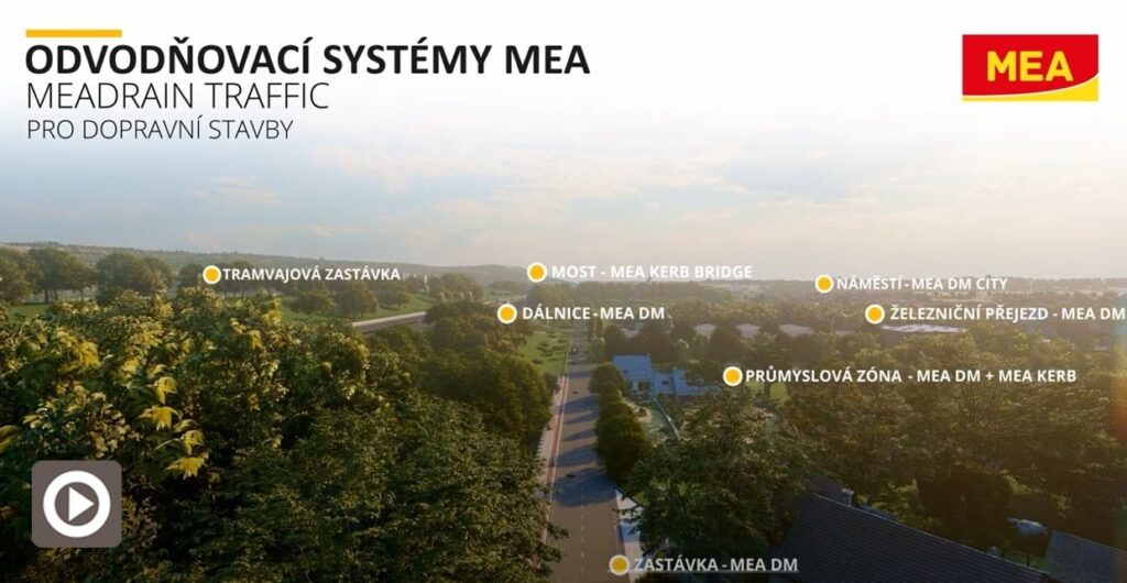 Odvodnění z polymerického betonu zahrnuje monolitické systémy pro extrémně namáhané aplikace (např. MEA DM 1000-1500-2000, obrubníkový systém MEA KERB, MEA BRIDGE KERB).