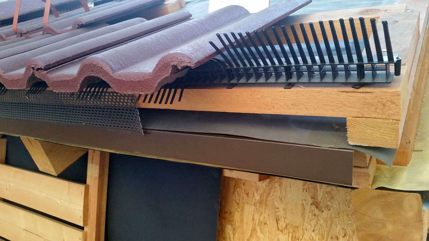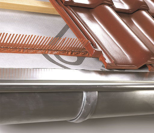 A protože střecha se pokládá od spodu, začněme větrací mřížkou, která plní dvě základní funkce: Za prvé je součástí odvětrání střechy, kdy pod poslední taškou plní funkci nasávacího otvoru. a za druhé zabezpečuje uzavření profilu tašky proti vletu ptáků a hnízdění u okapové hrany.