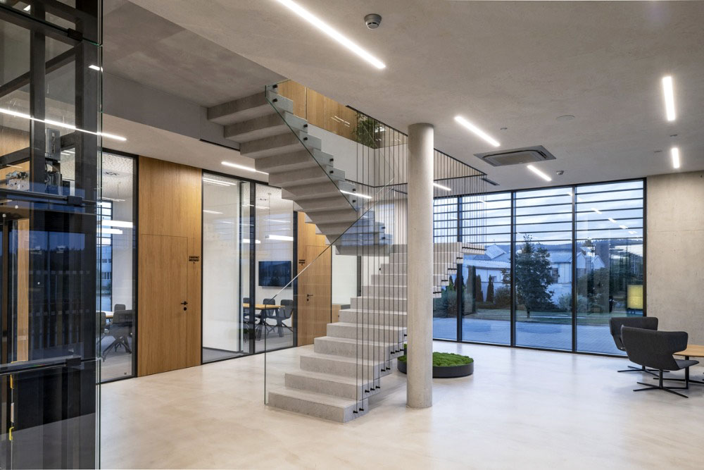 Vnitřnímu prostoru dvoupodlažního atria završeného světlíkem dominuje dvojramenné betonové konzolové schodiště se subtilním lankovým zábradlím a v zrcadle bodově kotvené skleněné desky navazující na zábradlí ochozu atria. Dvouramenné schodiště bez podpory s „levitující“ mezipodestou má šířku ramene 1,2 m a 24°. Autorem projektu nového sídla rodinné firmy Lanik je Eduard Štěrbák, Foto: Viktor Mácha