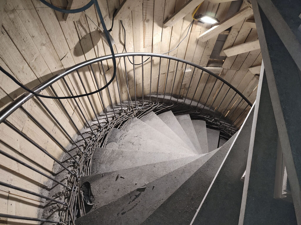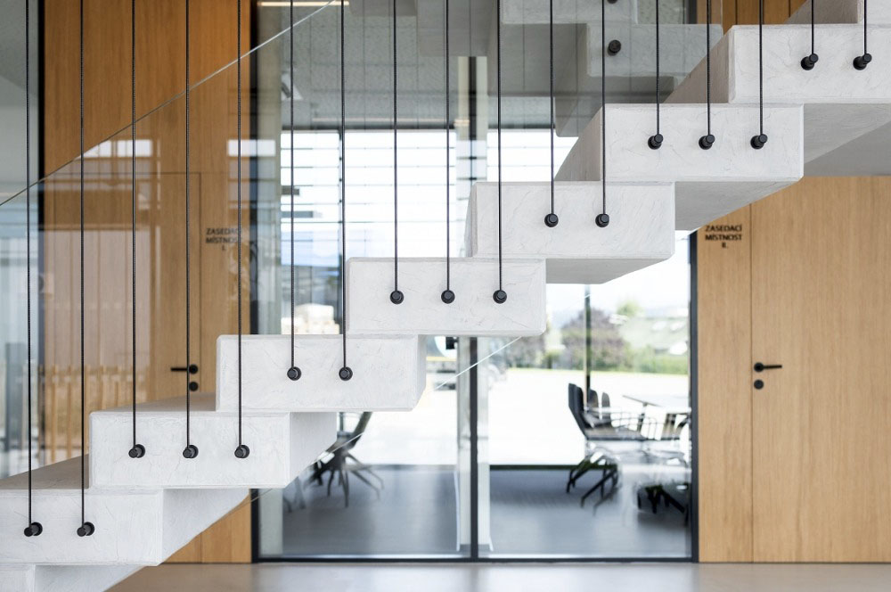 Museli jsme si vyvinout nadstandardně únosné prefabrikované stupně z UHPC betonu. Schodiště je široké 2,6 m a zatížení při počtu šesti osob by bylo tak extrémní, že hrozilo prohnutí hlavně posledního stupně. Kvůli tomuto stupni se dělaly zvláštní zátěžové zkoušky. Protože jsme potřebovali, aby stupně byly maximálně subtilní, jen 5 cm silné. Zkoušeli jsme to v brněnském AdMaS, což je výzkumná instituce, která je součástí Fakulty stavební Vysokého učení technického v Brně a zaměřujeme se na výzkum, vývoj a aplikace pokročilých konstrukcí a technologií ve stavebnictví.