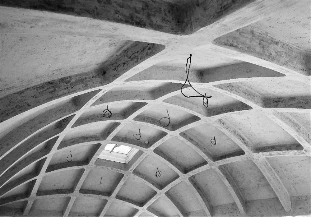 Konstrukci střechy nad 2. NP tvoří železobetonová skořepina vyztužená kónickými žebry. Její povrch byl lehce přebroušen a lokálně doplněn tak, aby barevné rozdíly byly co nejmenší. Betonová stropní klenba tvoří protiklad k zrekonstruovanému dřevěnému podkroví v původních budovách.
