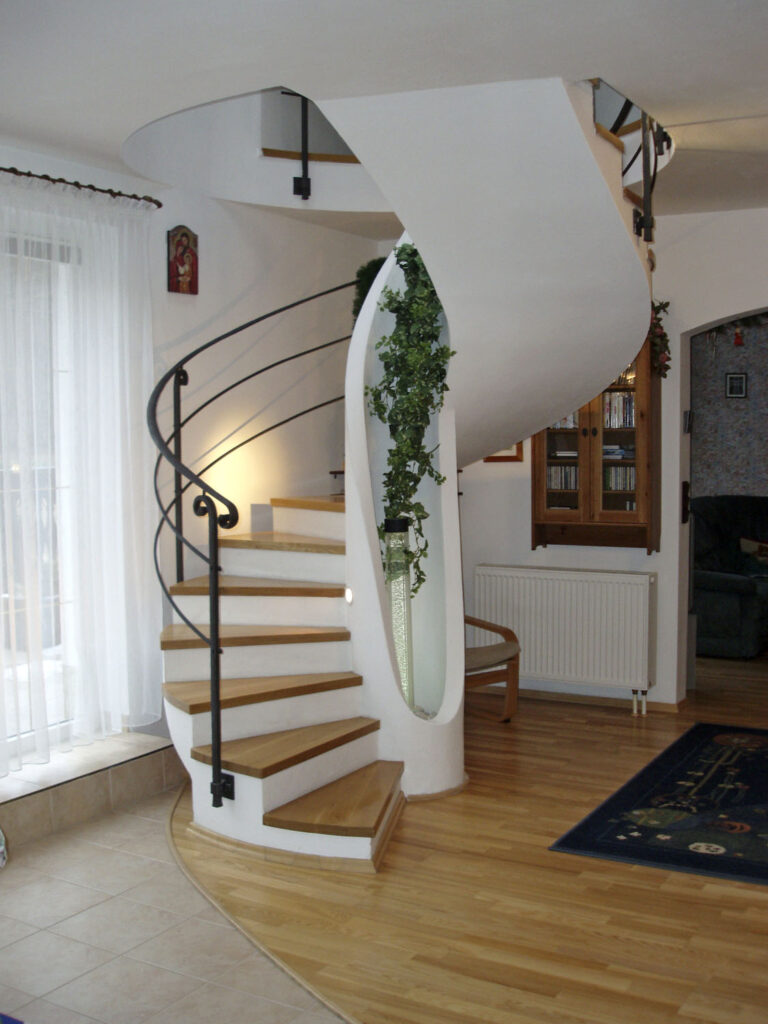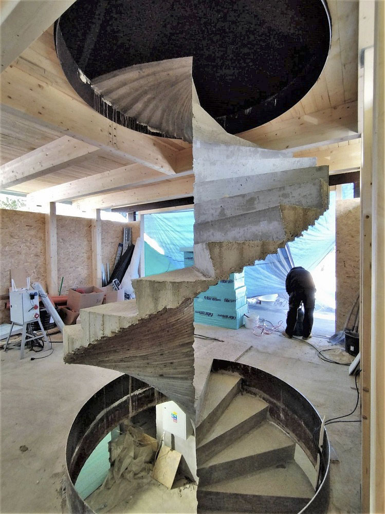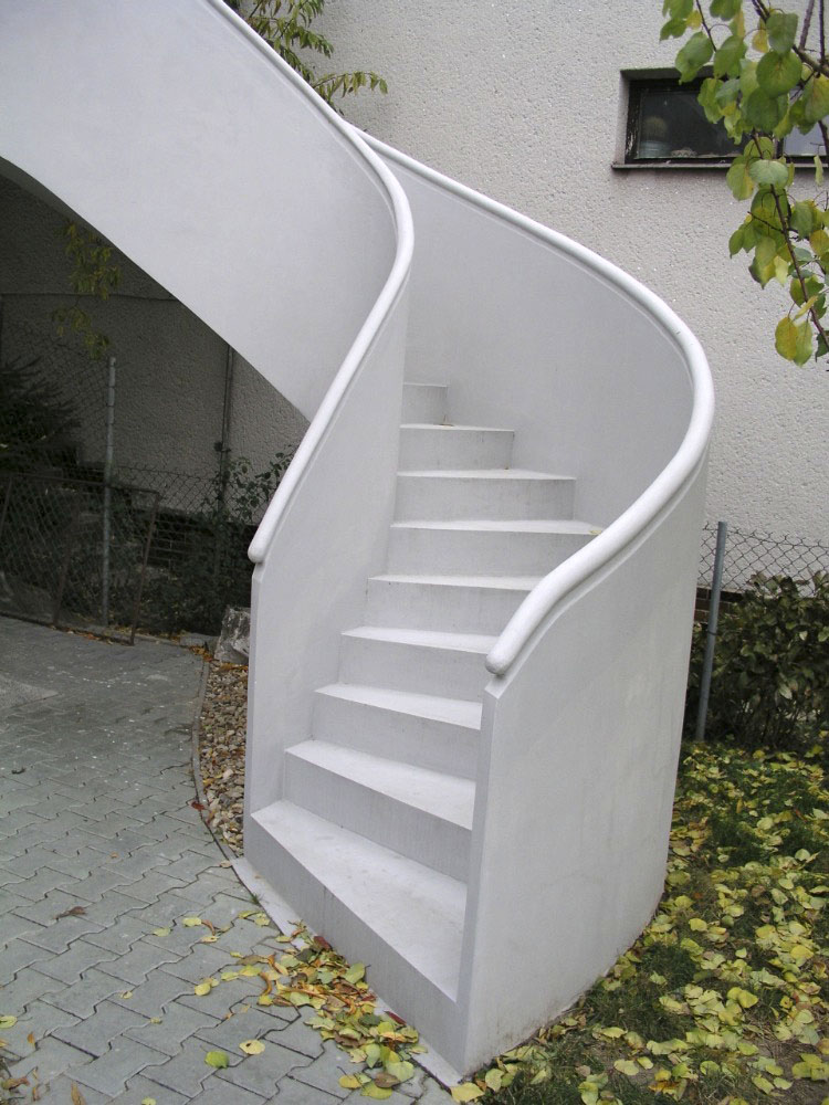K domu postavenému v osmdesátých letech 20. století bylo v roce 2004 přistaveno nové venkovní samonosné železobetonové monolitické točité schodiště s betonovým zábradlím. Železobetonová deska silná 100 mm tvořící schodiště se na vnější straně směrem k základu postupně rozšiřuje až na 160 mm. Základ je v nezámrzné hloubce opřený o skalnaté podloží a pro zlepšení přenášení krouticích momentů je na vnější straně rozšířen na šířku dvou stupňů, tj. 800 mm. Velmi pohodlné schodiště se 16 stupni