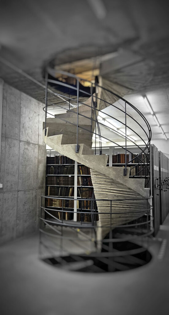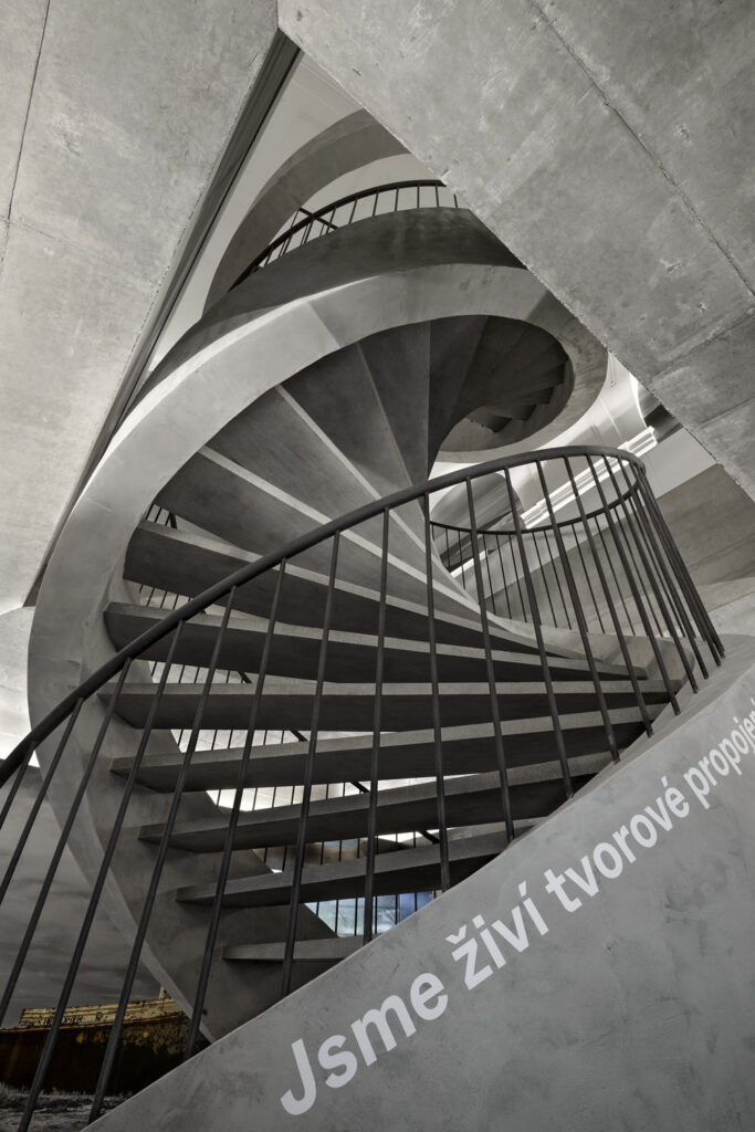 V roce 2001–2002 proběhlo statické zajištění a sanace Uměleckoprůmyslového musea v Praze. Do prostoru knihovny byly namísto dosavadních ocelových konstrukcí vloženy nosné a zároveň prostorově ztužující železobetonové desky. Konstrukčně nově koncipované patrové dělení depozitáře knih bylo doplněno výtahem a schodištěm. Schodiště spojuje tři podlaží s různými konstrukčními výškami. Konstrukci tvoří dvě subtilní spirály bez vřetena točící se kolem zrcadla s průměrem 160 mm. Pro dosažení pohodlné chůze a přijatelných podchodných výšek byly podstupnice jednotlivých stupňů podseknuty o 30 mm. Samonosná železobetonová spirála má přiznaný otisk bednění ve spodní části. Stupně a boční čela schodiště jsou potaženy odolnou speciální cementovou stěrkou. Generální dodavatel zajistil elegantní, na místě stáčené, lehké kovové zábradlí z hlazenky o tl. 16 mm. Autorem projektu byli Marcela Koukolová a Jan Novotný, subdodavatelem železobetonového schodiště DNA CZ, Břetislav Eichler, Foto: Michaela Špůrová, © UPM