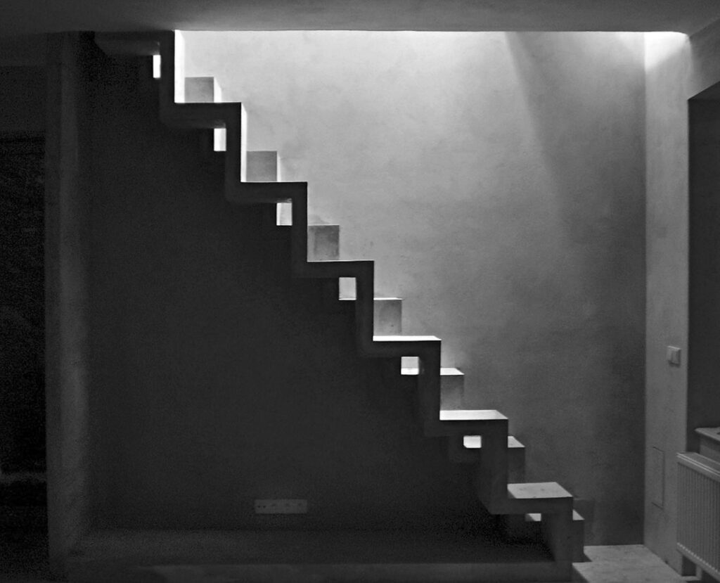 Z přibližně 2000 realizovaných schodišť jsou pouze dvě mlynářská. Toto je monolitické, druhé bylo postaveno z prefabrikovaných dílů. Do minimalistických prostor pro schodiště nám po dlouhých diskusích s architektem Janem Novotným (KAVA) vyšly pouze mlynářské schody. Pro oživení jsme nakonec vymysleli lomenicovou konstrukci o tloušťce pouhých 80 mm. V monolitu jsou ještě skryty rozvody a malá LED svítidla. Přes náročné postupy bednění se nám nakonec docela povedlo odlít tento kus v jednom celku. Stavebníci jsou velcí příznivci surového betonu, a proto jsme vystěrkovali jen několik málo míst a nášlapné plochy. Schodiště propojuje obývací pokoj s ložnicemi v podkroví a bylo realizováno v roce 2007, Foto: Viktor Ekrt