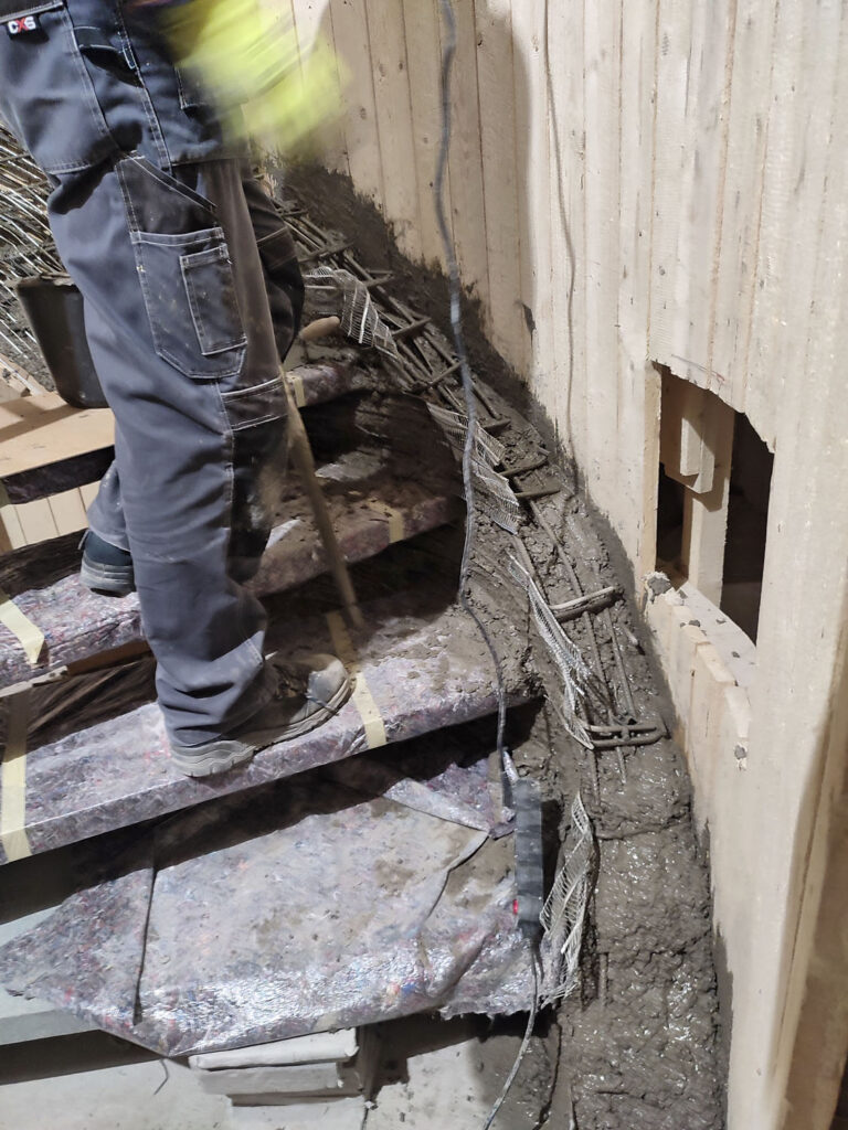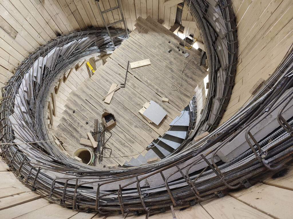 Stupeň se prohnul v nejnižším bodě o 7 cm a pak vrátil zpátky, protože to bylo kvalitně proarmované, zhotovené ze špičkového betonu, takže tam nejsou žádné mikrotrhliny. Dvě venkovní samonosné schodnice – takzvané stuhy – jsou monolitické, realizované přímo na místě. Mezi obě schodnice jsme jednotlivé stupně postupně propojili, doarmovali a dobetonovali.