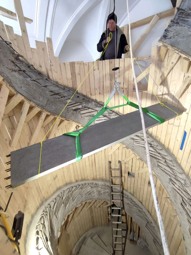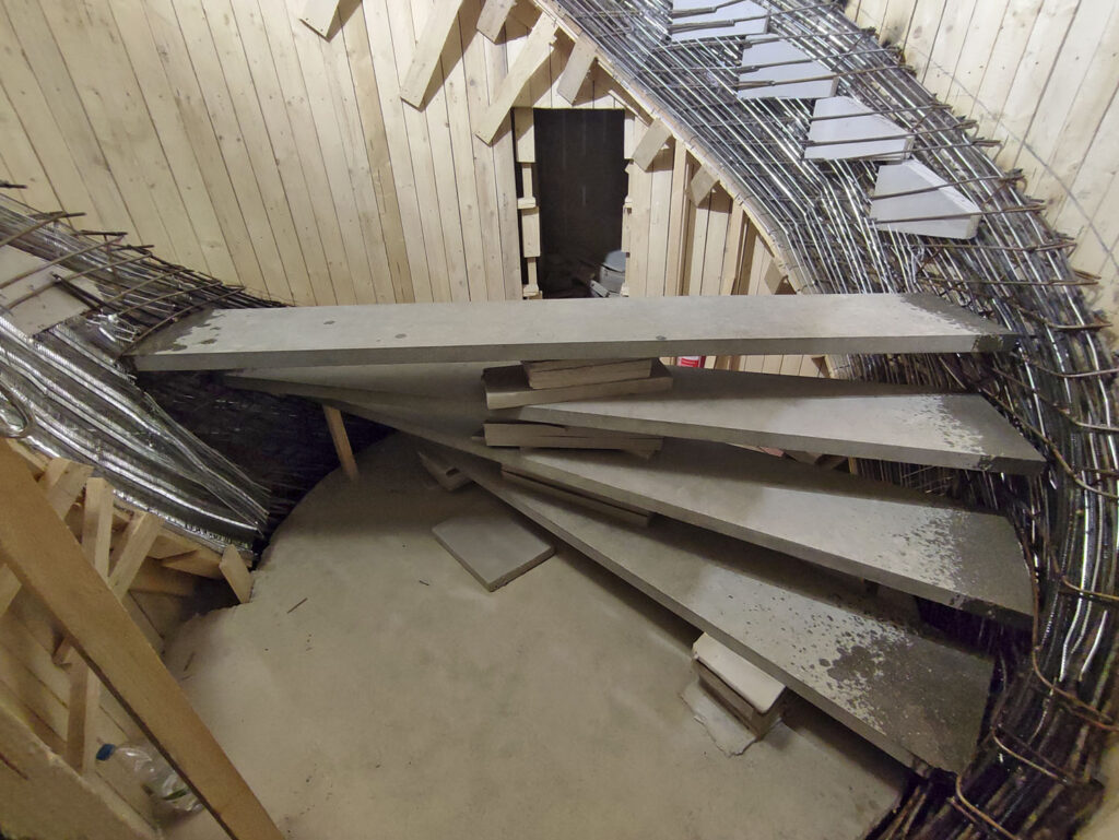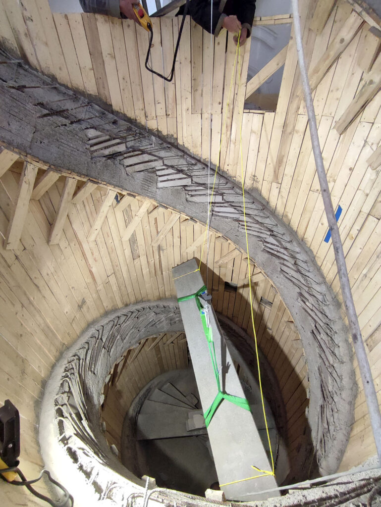 Trvalo nám to tři čtvrtě roku až po stěrky. První dva měsíce jsem jezdil dvakrát týdně do Vrchlabí, abych zkontroloval, jestli práce probíhají tak, jak mají, a jestli to, co jsem nosil v hlavě, jsem schopen přenést do reality, protože šlo o konstrukčně nesmírně náročný projekt. Chtěl jsem být přítomen co nejčastěji, protože jsme na místě řešili spoustu detailů, které by mohly ovlivnit hlavně statiku: uložení výztuže, propojení se stupni. Velké diskuse jsme měli také se statikem. Aby vše dokázal spočítat, tak jsme vytiskli model ve 3D. Je to tolikrát spojené a propojené, že není možné, aby se zbortilo. Už dlouho, co se věnuji schodištím, spolupracuji se statikem Ing. Václavem Nevřivou a vrchlabské schodiště bylo pro nás zatím nejnáročnější. Vedle prefabrikovaného stupně z UHPC je konstrukce provedena z betonu 35/37- XC2 a je dobedněné, armované, vibrované.