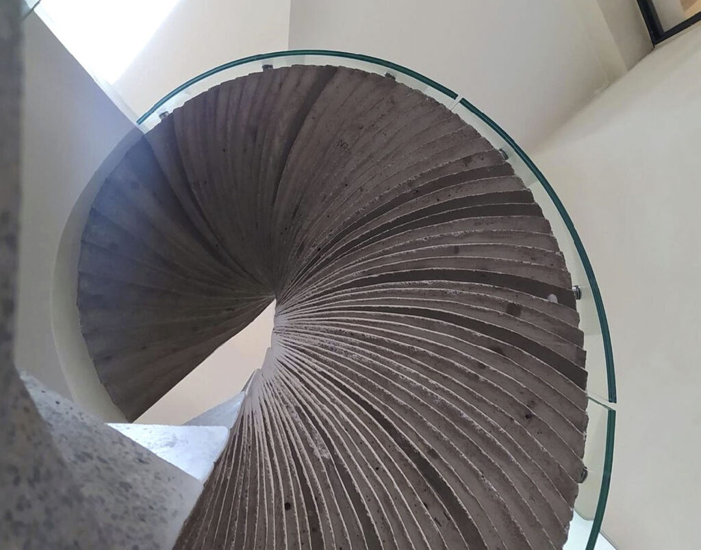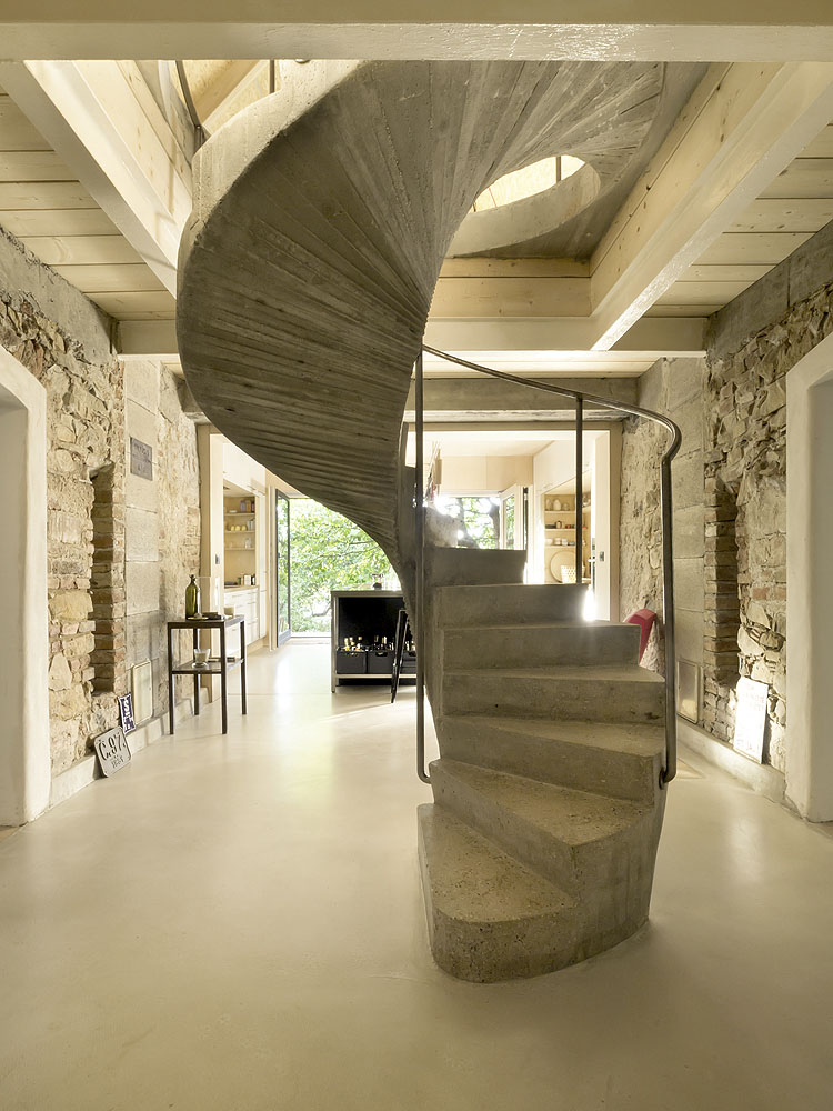 Schodiště propojuje několik úrovní původního hospodářského křídla rozsáhlé zemědělské usedlosti v Rantířově. Subtilní elegantní konstrukce betonové spirály se nejen lehce vine přes všechna podlaží, ale