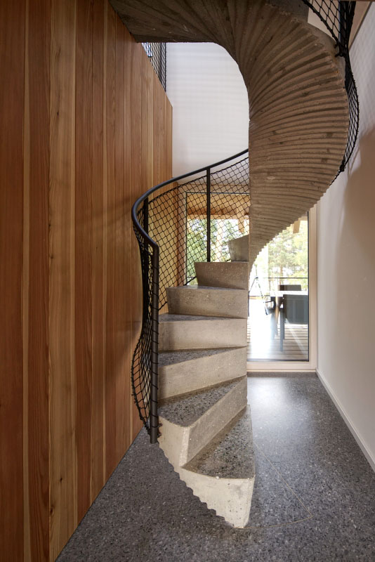Jedná se o další schodiště inspirovaná japonským architektem Kazunorim Fujimotem. Dvě samostatné subtilní schodišťové spirálové konstrukce jsou umístěny nad sebou a spojují technické podlaží v suterénu s podkrovím dřevostavby Foto: Břetislav Eichler