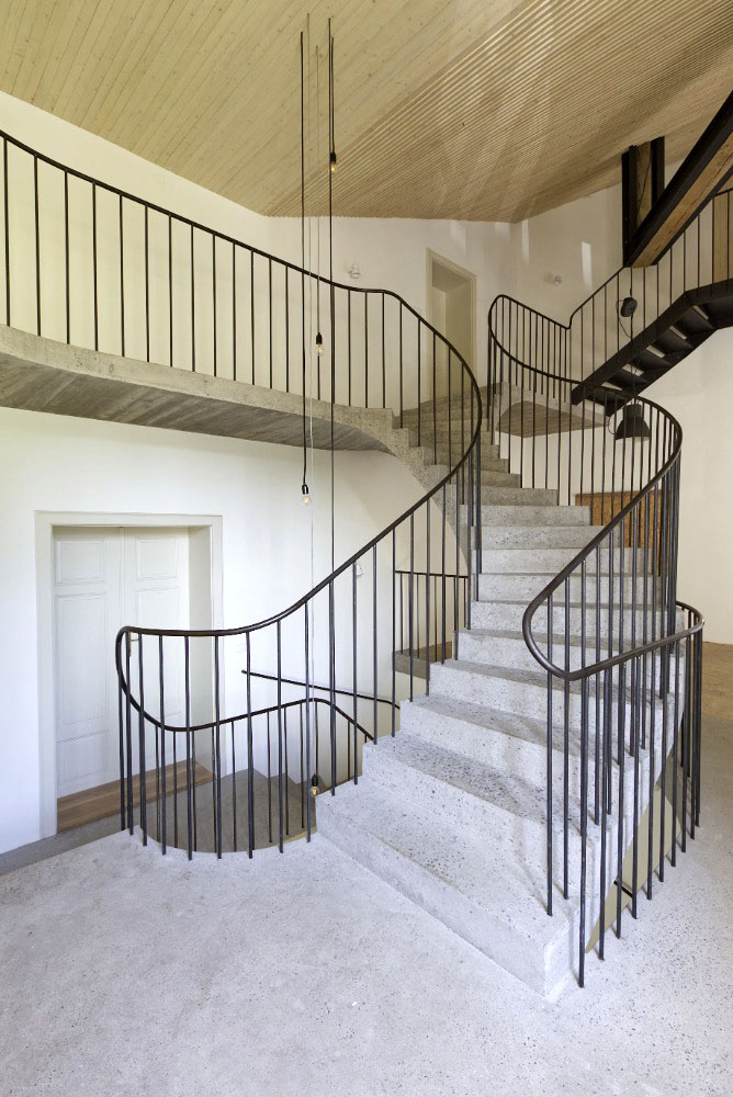 v nejvyšším patře se z důvodu rozdílných výšek jednotlivých křídel budovy zároveň otevře do dvou směrů. Vzhledem k rozsáhlé ploše půdorysu nově zbudovaného otvoru pro schodiště spirála v některých úrovních tvoří zároveň strop i podlahu. Na zábradlí se podílel místní mistr zámečník pan Drbal. Autory projektu rekonstrukce statku jsou A1 Architects, rekonstrukce byla dokončena v roce 2014, Foto: David Maštálka