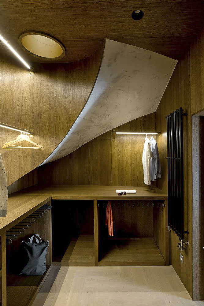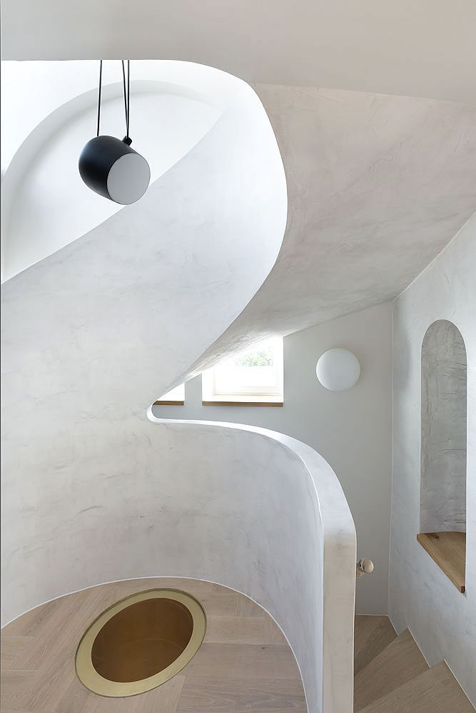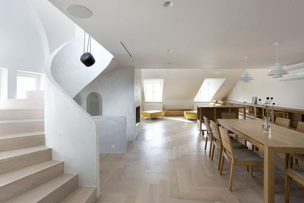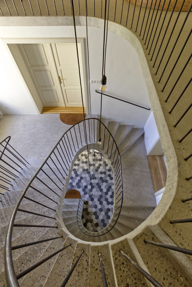 Třípodlažní loft se nachází v činžovním domě z konce 19. století na Novém Městě pražském. Hlavním motivem interiéru je nové spirálové schodiště, které pohodlně propojuje všechna tři podlaží. Zajímavostí je čočka ve stropu zrcátka schodiště na úrovni 2. NP, která osvětluje šatnu o patro níže. Autory projektu jsou a1architects – David Maštálka a Lenka Křemencová. Realizace proběhla v roce 2016, Foto: David Maštálka