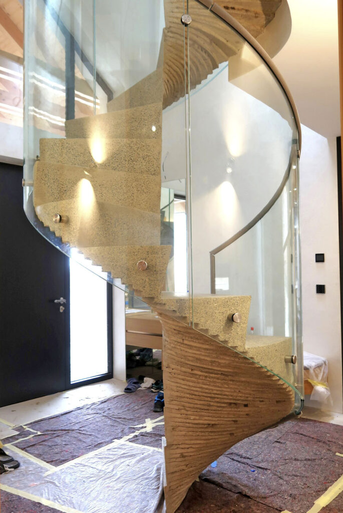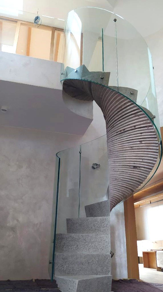 Další ze schodišť inspirovaných Kazunorim Fujimotem. Úzké, jen 1,3 m široké spirálové schodiště se skleněným zábradlím má půlkružnicový půdorys, Foto: Alia Systém – realizátor skleněného zábradlí