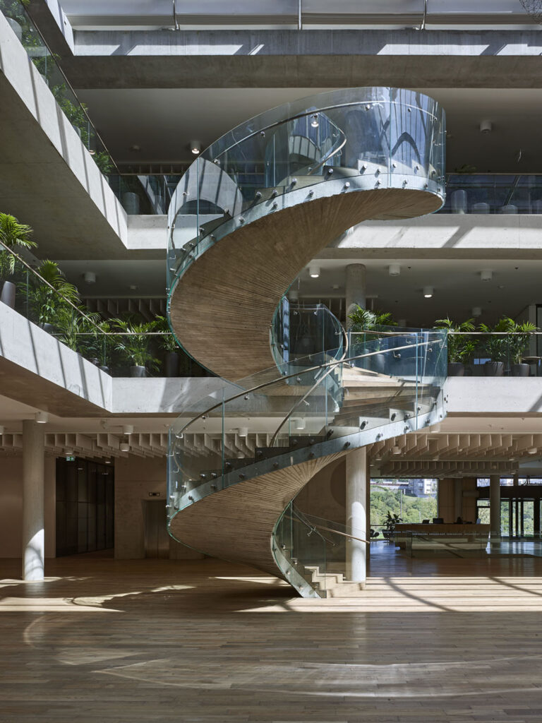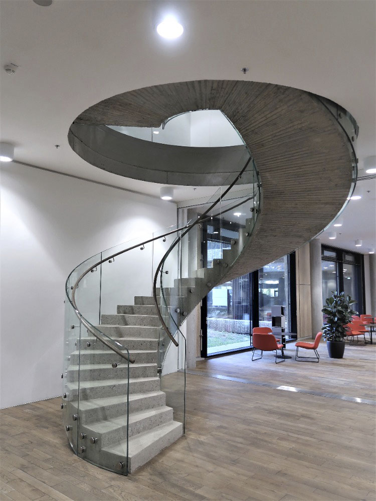 Samonosná spirálová betonová plocha je uložena ve speciálních protihlukových pouzdrech. Bez dalších podpor nese stupně z masivního dubového dřeva. Zábradlí tvoří desky z ohýbaného skla, madla jsou z masivního ohýbaného dubu. Schodiště je umístěno ve dvoraně – hlavní prostoře nové budovy