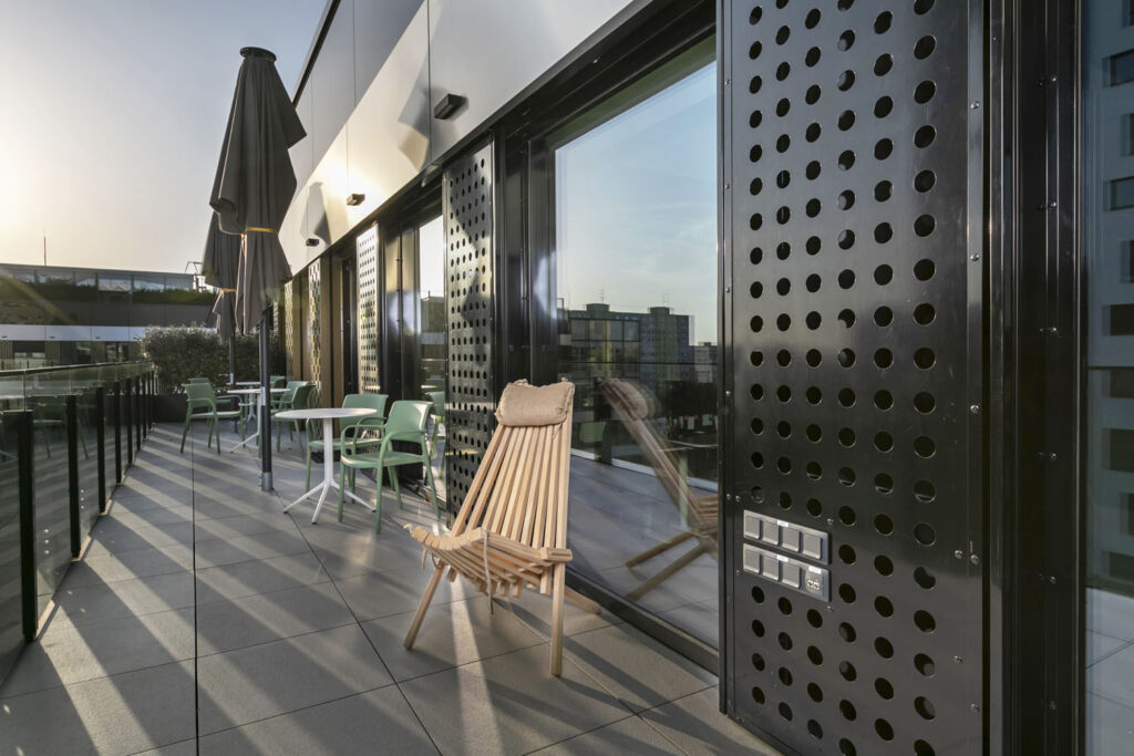 „Na terasy, balkóny obou budov Einpark byly vybrány keramické outdoorové dlaždice Kaamos Outdoor 60 x 60 cm se zesílenou tloušťkou 2 cm jako optimální řešení z několika klíčových důvodů,“ dodává Peter Tomčík, technický poradce RAKO. „Jejich jedinečná odolnost vůči proměnlivým podmínkám počasí zaručuje dlouhou životnost a minimální nároky na údržbu, což je ideální pro vytížené venkovní prostory komerčních prostorů.  Maximální snahou projektového týmu RAKO je vždy dodat do projektu ty nejlepší materiály vyhovující přísným technickým parametrům a požadavkům investora,“ doplňuje Tomčík. Dlaždice jsou nejen trvanlivé, nehořlavé, ale také ekologicky šetrné, čímž přispívají ke snižování ekologické stopy celé budovy. Jsou vyráběny s ohledem na životní prostředí a podporují zelené stavitelství, které je klíčové pro získání certifikátů jako LEED PLATINUM a LEED Zero Carbon. Díky svým estetickým vlastnostem navíc harmonicky zapadají do sofistikovaného designu budovy, což zajišťuje příjemné a zdravé pracovní prostředí pro všechny uživatele kanceláří i bytů. V koupelnách a v dalších prostorech byly také využity keramické obklady RAKO ve formátech 60 x 60 a 30 x 60 cm s ohledem na ekologii, zdravotní nezávadnost materiálů a podobně.