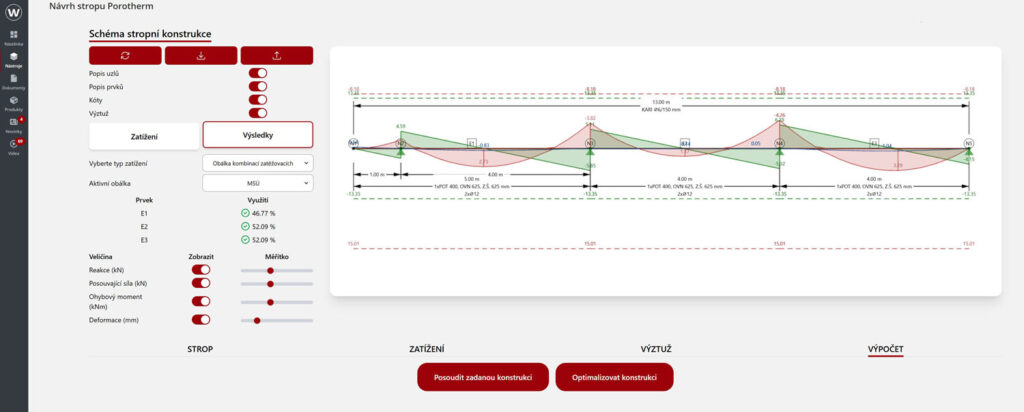 Program si samozřejmě vše přenáší do výpočtu a na základě potvrzených hodnot vše zohlední ve výpočtu. Výsledky jsou potom v číselné i grafické podobě a lze si je dle své potřeby i upravit (velikost, zobrazované hodnoty, kombinace zatížení apod. – obr. 9). Při zadávání v programu Návrh stropu Porotherm (obr. 10) se postupuje s trochu jinou filozofií.