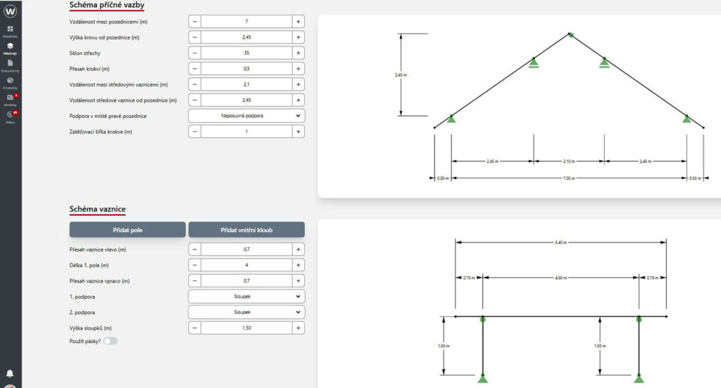 Pokud zvolíme vaznicový krov (obr. 5) objeví se nám pod obrázkem příčné vazby i možnost zadat současně vaznici, do které se automaticky přenese zatížení od krokví. Vaznici můžeme zadat uloženou na sloupcích či stěně s možností překonzolování. Tím získáme i zatížení do sloupku krovu pro posouzení navazující konstrukce (u MIAKO stropu Porotherm můžeme posoudit pomocí dalšího programu Návrh stropu Porotherm).