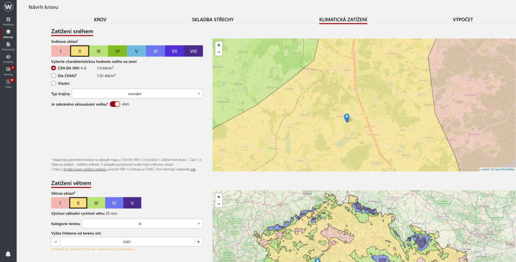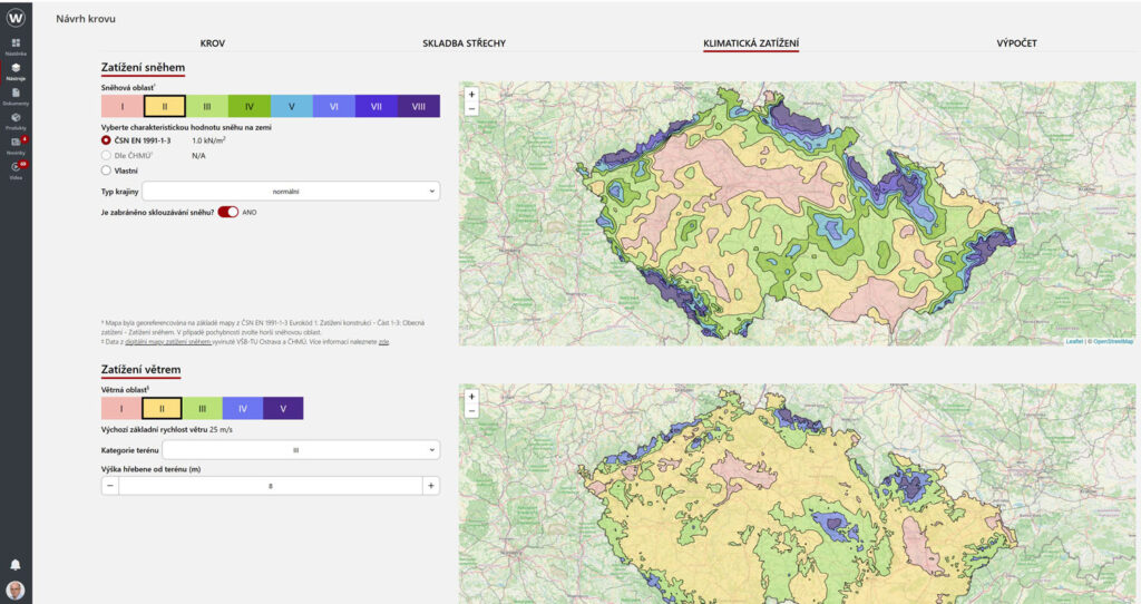 Takže stálé zatížení máme za sebou a jdeme na proměnné zatížení. To je pro většinu nestatiků až zdánlivě nepřekonatelný problém – zejména od zatížení větrem. Ale i to zde lze opět velice jednoduše určit jen s pomocí „myši“, a to včetně nahodilého zatížení od sněhu či větru. Uživatel má možnost intuitivně bez hlubších znalostí určit sněhovou či větrnou oblast (interaktivní mapa – obr. 7). Myší ukáže a klikne, „kde staví“, a program okamžitě určí sněhovou oblast a vypíše zatížení nejen dle ČSN, ale i dle ČHMÚ. Samozřejmě, můžete namítnout, že strefit se přesně na mapě je nereálné, ale jen do doby, než zjistíte, že scrollováním lze mapu přiblížit či oddálit (obr. 8). Podle místa stavby se určí nejen zatížení od sněhu, ale současně i od větru – mapy jsou totiž propojené, a to dokonce obousměrně.