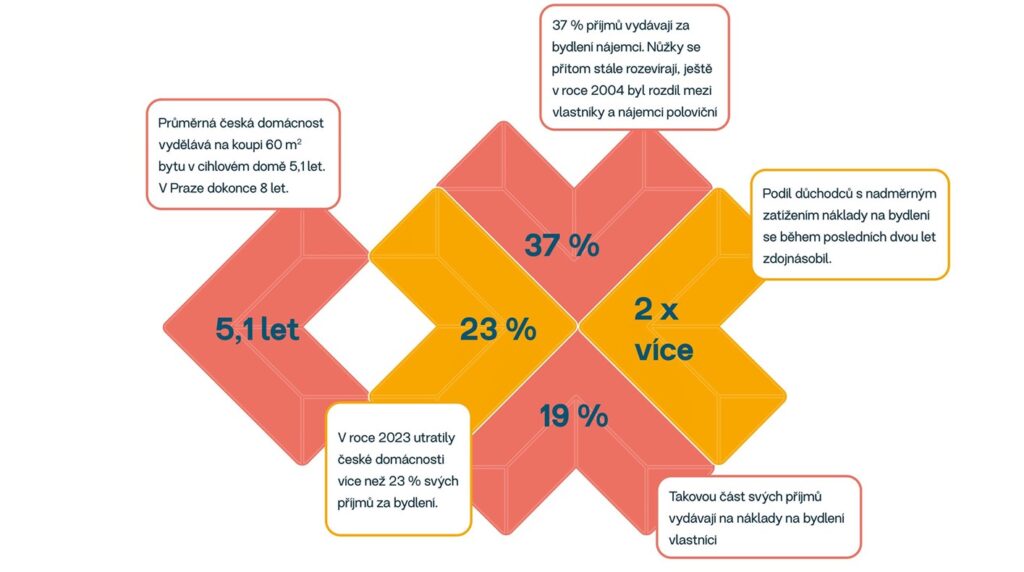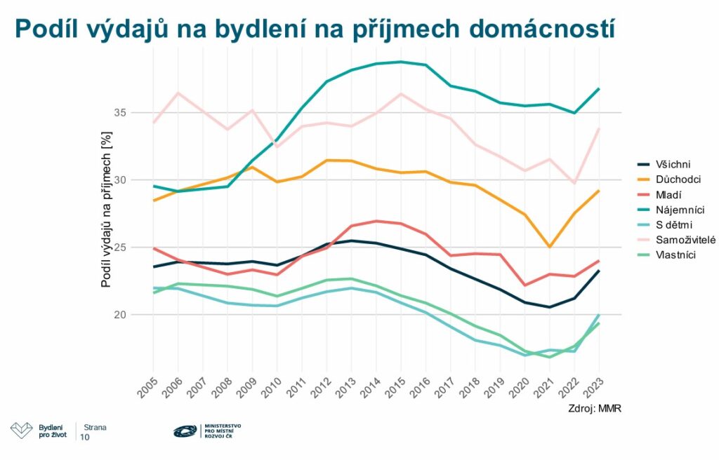 Nejvíce jsou výdaji na bydlení zatížení lidé žijící v Praze a méně prosperujících krajích, jako je Moravskoslezský, Ústecký a Liberecký. V posledních letech došlo ke zvýšení zátěže domácností i zvýšení podílu těch, pro které je to zátěž nadměrná. Nízkopříjmové domácnosti vynakládají na bydlení přes 40 % příjmů, nájemníci 36,8 % a samoživitelé 33,8 %. V evropském srovnání se Česko dlouhodobě pohybuje mírně nad průměrem EU, k větším nárůstu došlo hlavně v posledním roce. Nadměrnými výdaji na bydlení je ohroženo 40 % nízkopříjmových domácnosti, téměř 36 % nájemníků a přes 30 % samoživitelů. V roce 2021 měl nadměrné výdaje na bydlení zhruba každý desátý důchodce, aktuálně je to téměř každý pátý. Nájemci jsou na tom však jako skupina ohrožená nadměrnými náklady na bydlení ještě daleko hůře: dostávají se do podobných problémů s placením nákladů na bydlení jako v letech 2011–2016, kdy negativně působila současně ekonomická krize a deregulace nájemného.