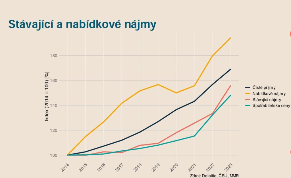 Významný je i rozdíl mezi novými a starými nájemními smlouvami. Za posledních deset let rostlo nájemné nabízené pro nové tržní smlouvy výrazně rychleji než u těch běžících. Zatímco průměrný nájem domácností v tržním nájmu vzrostl od roku 2014 o 56 %, na realitních portálech byl nárůst o 94 %. Čisté příjmy vzrostly za stejné období o 69 %.