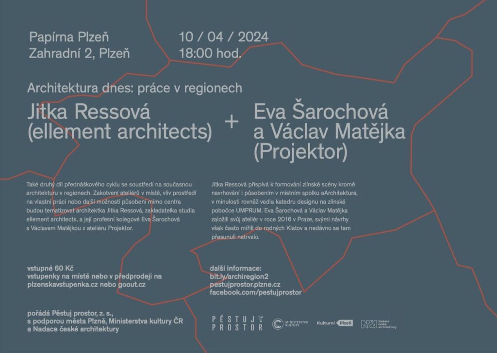 Také druhý díl přednáškového cyklu se soustředí na současnou architektonickou práci v tuzemských regionech. Zakotvení ateliérů v místě, vliv prostředí na vlastní práci nebo další možnosti působení mimo centra budou tematizovat architektka Jitka Ressová, zakladatelka studia ellement architects, a její profesní kolegové Eva Šarochová s Václavem Matějkou z ateliéru Projektor. Přednáška s navazující diskusí se uskuteční ve středu 10. dubna 2024 od 18 hodin v kulturním prostoru Papírna Plzeň.