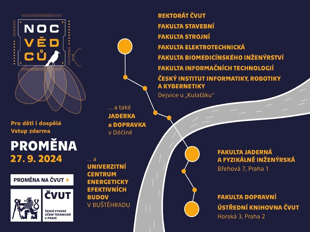 Noc vědců se letos bude konat 27. září od 17:00 do 22:00. Za ČVUT se jí účastní sedm fakult z osmi, dále Český institut informatiky, robotiky a kybernetiky (CIIRC), Univerzitní centrum energeticky efektivních budov (UCEEB) a Ústřední knihovna, soutěž o drobné výhry připravil i rektorát univerzity.