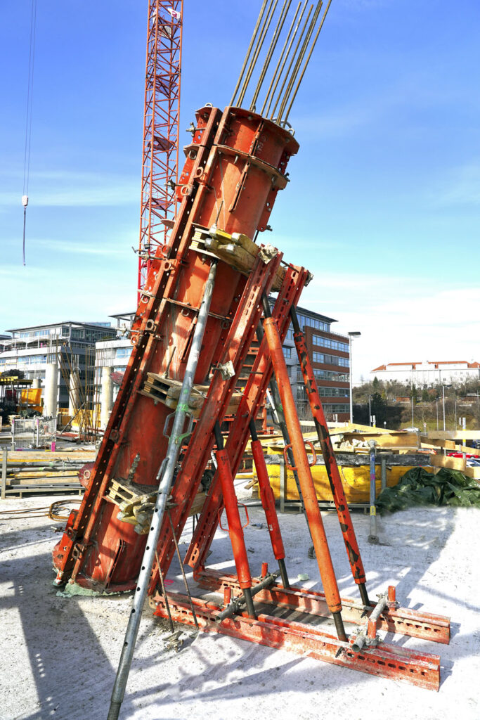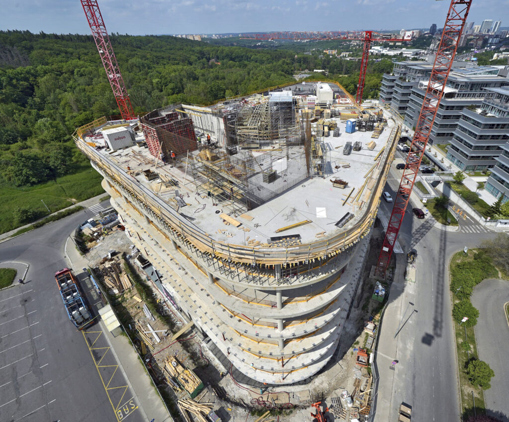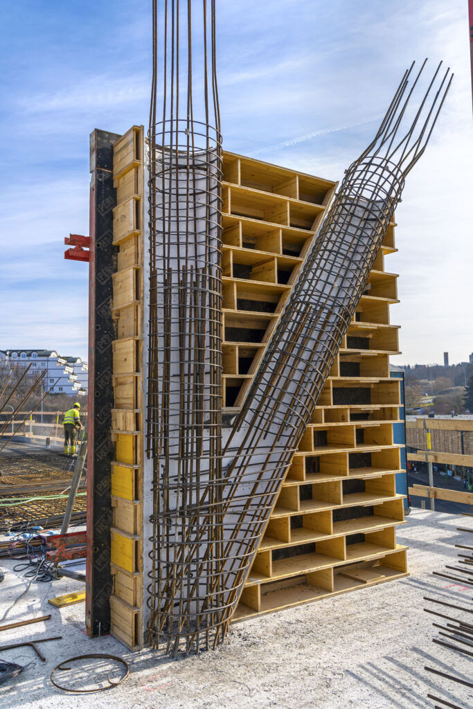 Stavba obsahovala kromě jiného také velké množství kruhových sloupů, které mají v nižších podlažích tvar V. Zde byl nasazen systém ocelového kruhového bednění SRS v některých místech s dřevěnými zárodky a v případě zdvojených sloupů ve tvaru V se systémem bednění TRIO a ramenátovými vložkami.