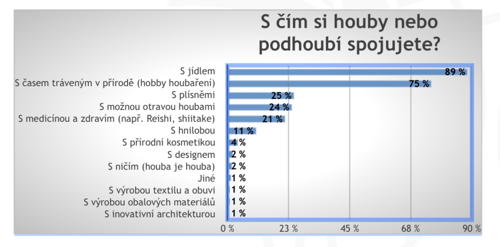 Spojení hub s designem si umí představit pouze 2 % Čechů. Do kontextu s inovativní architekturou si je dokáže dosadit ještě méně z nás, necelé 1 %. Přes 40 % lidí si neumí představit, že by doma měli nějaký výrobek z podhoubí.